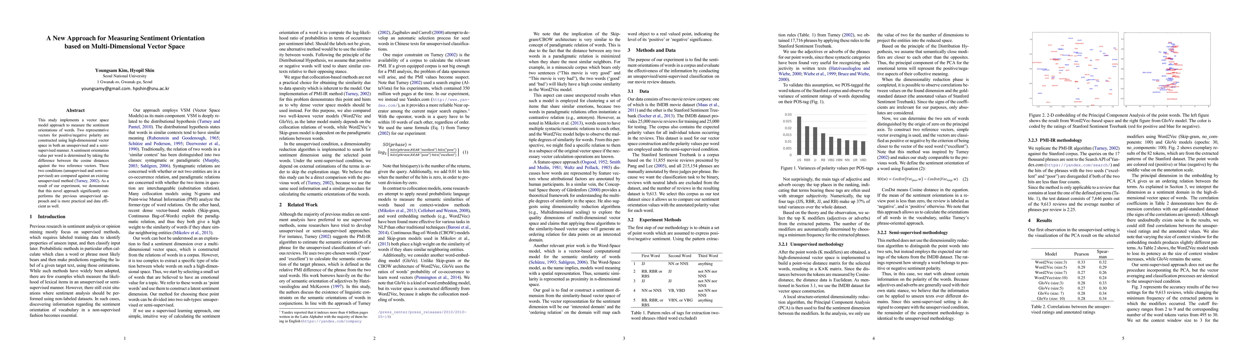 This study implements a vector space model approach to measure the sentiment orientations of words. Two representative vectors for positive/negative polarity are constructed using high-dimensional vec-tor space in both an unsupervised and a semi-supervised manner. A sentiment ori-entation value per word is determined by taking the difference between the cosine distances against the two reference vec-tors. These two conditions (unsupervised and semi-supervised) are compared against an existing unsupervised method (Turney, 2002). As a result of our experi-ment, we demonstrate that this novel ap-proach significantly outperforms the pre-vious unsupervised approach and is more practical and data efficient as well.