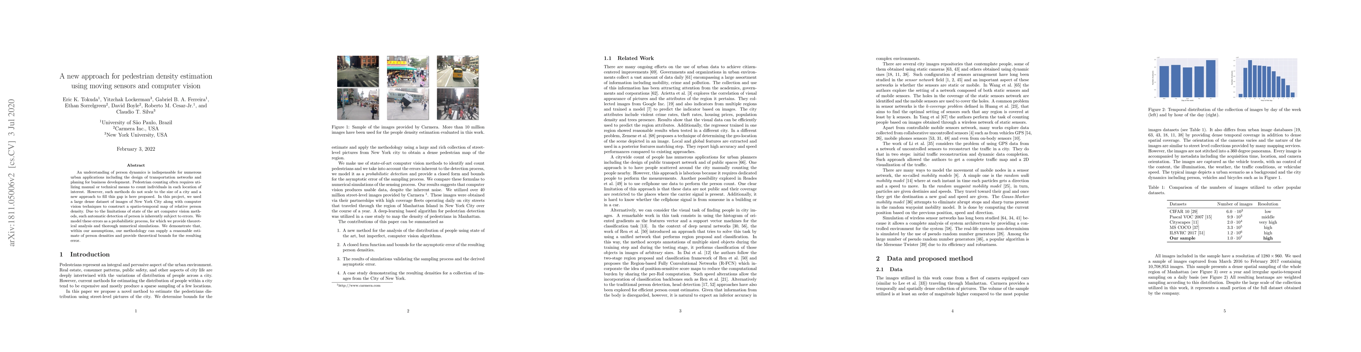 This paper proposes a novel method for estimating pedestrian density using moving sensors and computer vision techniques, leveraging a large dataset of New York City images. The authors model detection errors probabilistically and demonstrate that their approach can provide reasonable density estimates with theoretical bounds on error.