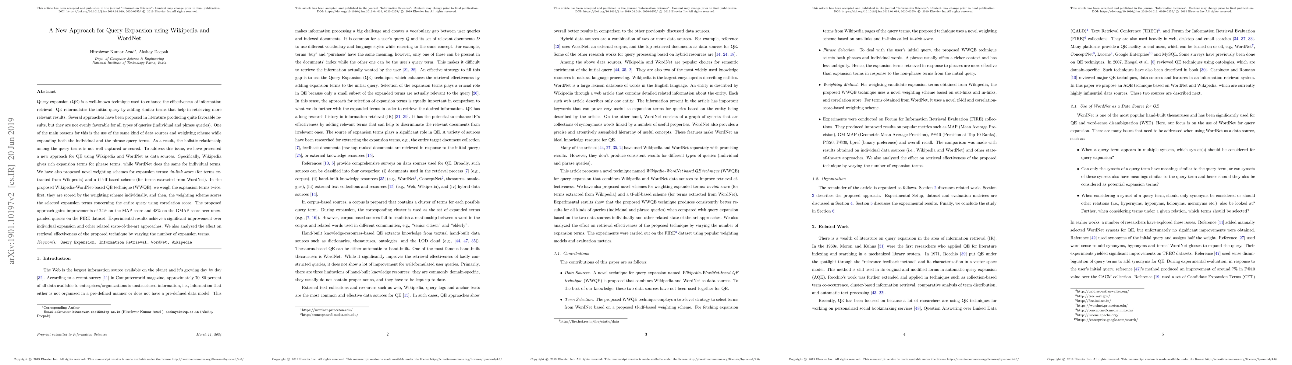 This paper introduces a novel query expansion method using Wikipedia and WordNet to enhance information retrieval. The approach separately utilizes Wikipedia for phrase queries and WordNet for individual terms, employing distinct weighting schemes to better capture query relationships. Experimental results show a 24% improvement in MAP score and a 48% improvement in GMAP score over unexpanded queries.