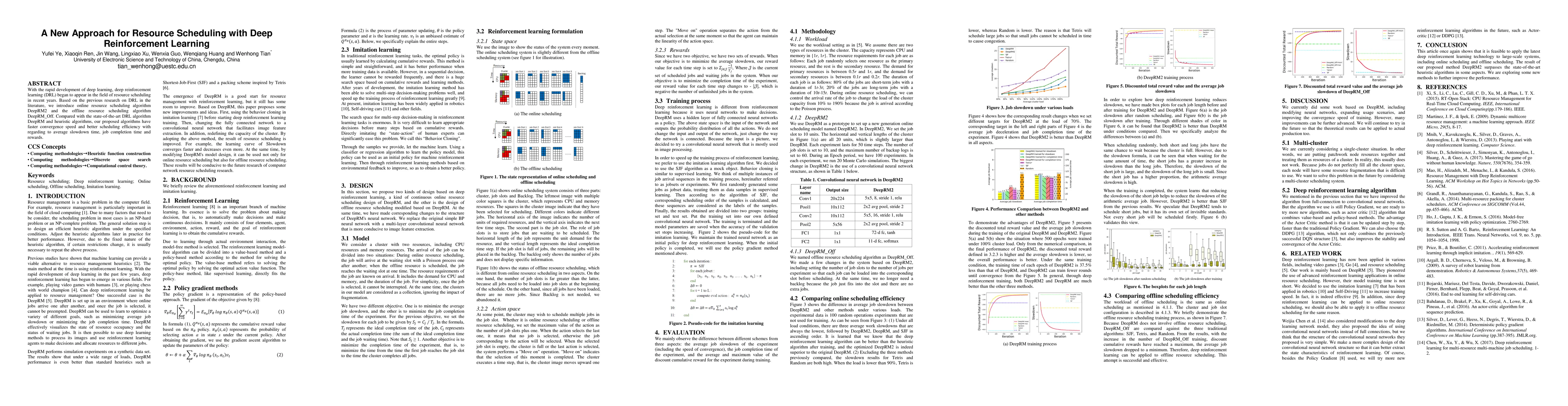 With the rapid development of deep learning, deep reinforcement learning (DRL) began to appear in the field of resource scheduling in recent years. Based on the previous research on DRL in the literature, we introduce online resource scheduling algorithm DeepRM2 and the offline resource scheduling algorithm DeepRM_Off. Compared with the state-of-the-art DRL algorithm DeepRM and heuristic algorithms, our proposed algorithms have faster convergence speed and better scheduling efficiency with regarding to average slowdown time, job completion time and rewards.