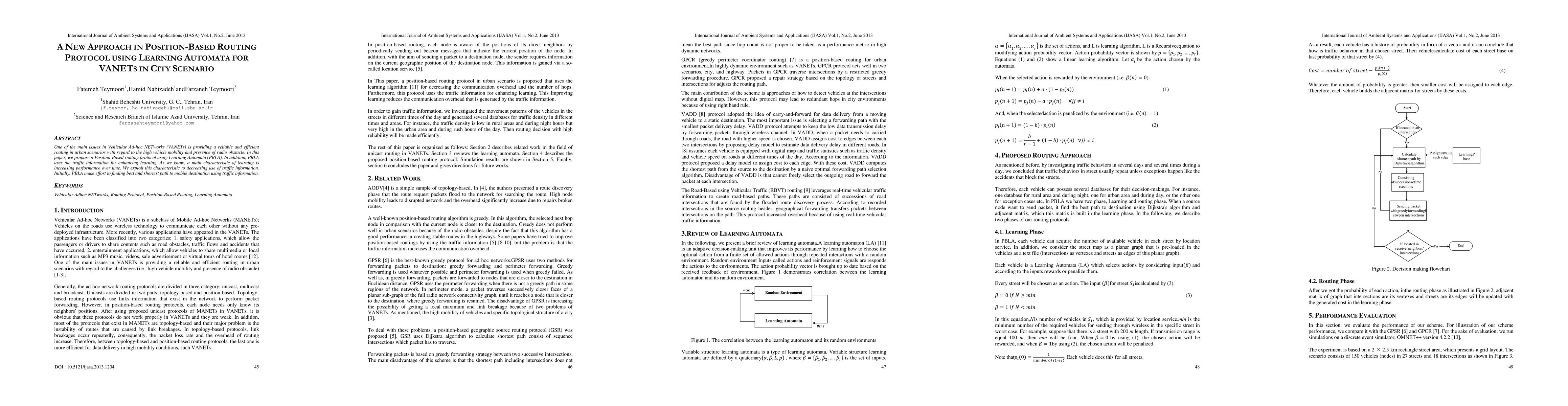 Summary: This paper proposes a Position-Based routing protocol using Learning Automata (PBLA) for VANETs in urban scenarios, aiming to provide reliable and efficient routing amidst high vehicle mobility and radio obstacles. PBLA leverages traffic information initially and enhances learning to reduce reliance on it over time, optimizing pathfinding for mobile destinations.