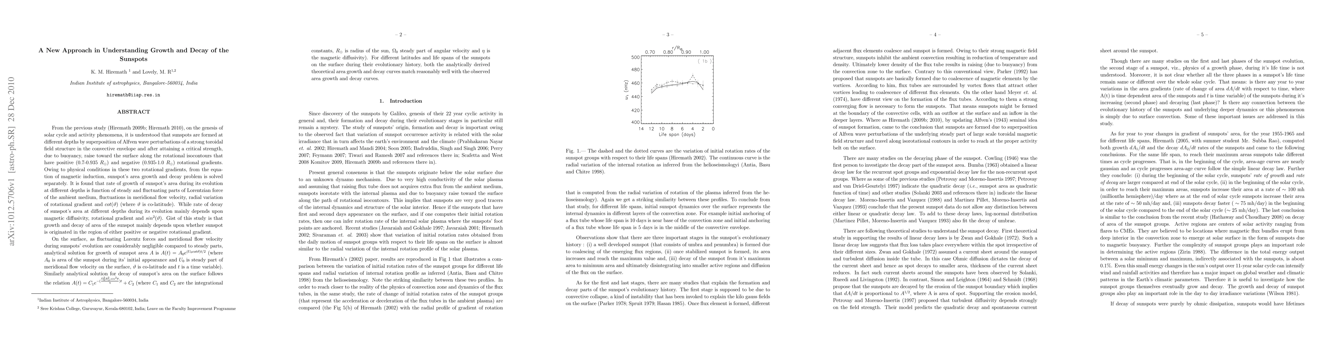 From the previous study (Hiremath 2009b; Hiremath 2010), on the genesis of solar cycle and activity phenomena, it is understood that sunspots are formed at different depths by superposition of Alfven wave perturbations of a strong toroidal field structure in the convective envelope and after attaining a critical strength, due to buoyancy, raise toward the surface along the rotational isocontours that have positive (0.7-0.935 $R_{\odot}$) and negative (0.935-1.0 $R_{\odot}$) rotational gradients. Owing to physical conditions in these two rotational gradients, from the equation of magnetic induction, sunspot's area growth and decay problem is solved separately. It is found that rate of growth of sunspot's area during its evolution at different depths is function of steady and fluctuating parts of Lorentzian force of the ambient medium, fluctuations in meridional flow velocity, radial variation of rotational gradient and $cot(\vartheta)$ (where $\vartheta$ is co-latitude). While rate of decay of sunspot's area at different depths during its evolution mainly depends upon magnetic diffusivity, rotational gradient and $sin^{2}(\vartheta)$. Gist of this study is that growth and decay of area of the sunspot mainly depends upon whether sunspot is originated in the region of either positive or negative rotational gradient. For different latitudes and life spans of the sunspots on the surface during their evolutionary history, both the analytically derived theoretical area growth and decay curves match reasonably well with the observed area growth and decay curves.