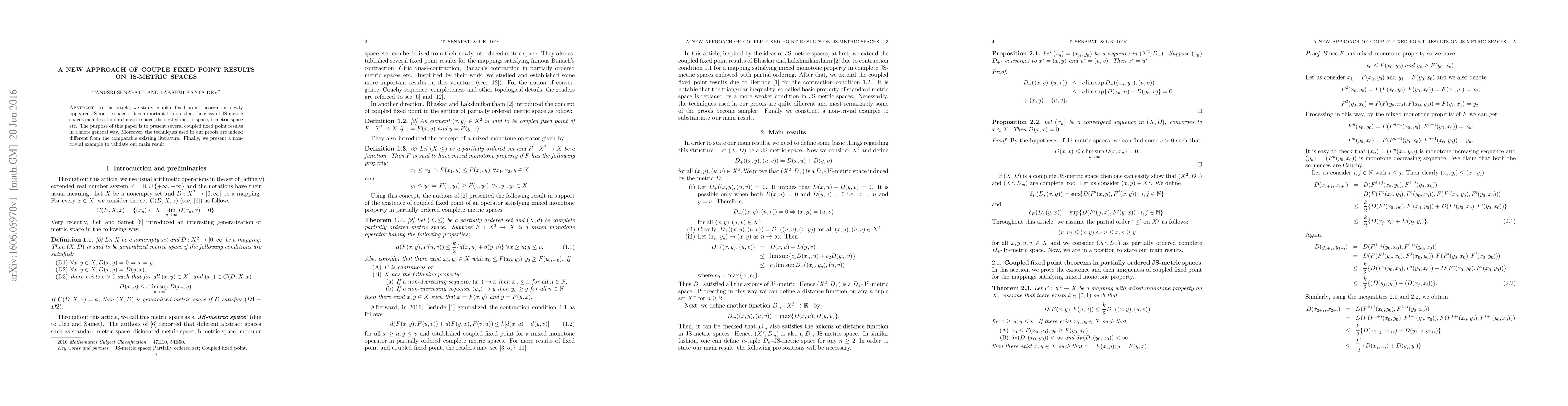 This paper introduces novel coupled fixed point theorems in JS-metric spaces, which encompass various types of metric spaces. The authors present these results using distinct techniques, differing from existing literature, and validate their findings with a non-trivial example.