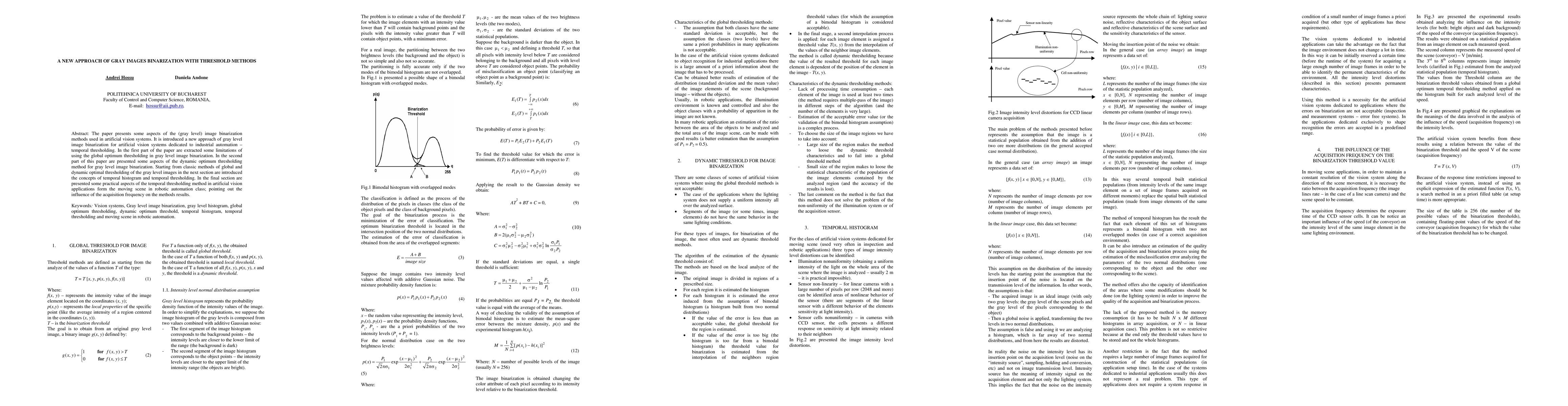 A new approach for binarizing gray images using temporal thresholding is introduced, offering improved results in industrial automation applications. The research highlights the impact of acquisition frequency on method performance.