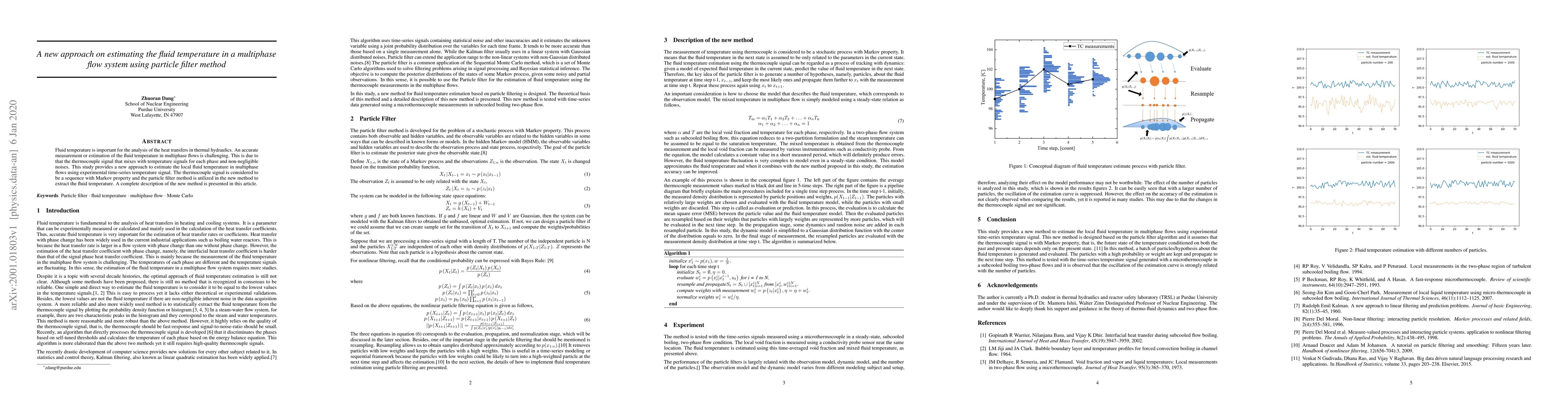 This paper introduces a novel method for estimating fluid temperature in multiphase flow systems using particle filter techniques, focusing on extracting accurate temperature signals from noisy thermocouple data with Markov properties. The proposed approach aims to improve the analysis of heat transfer in thermal hydraulics.