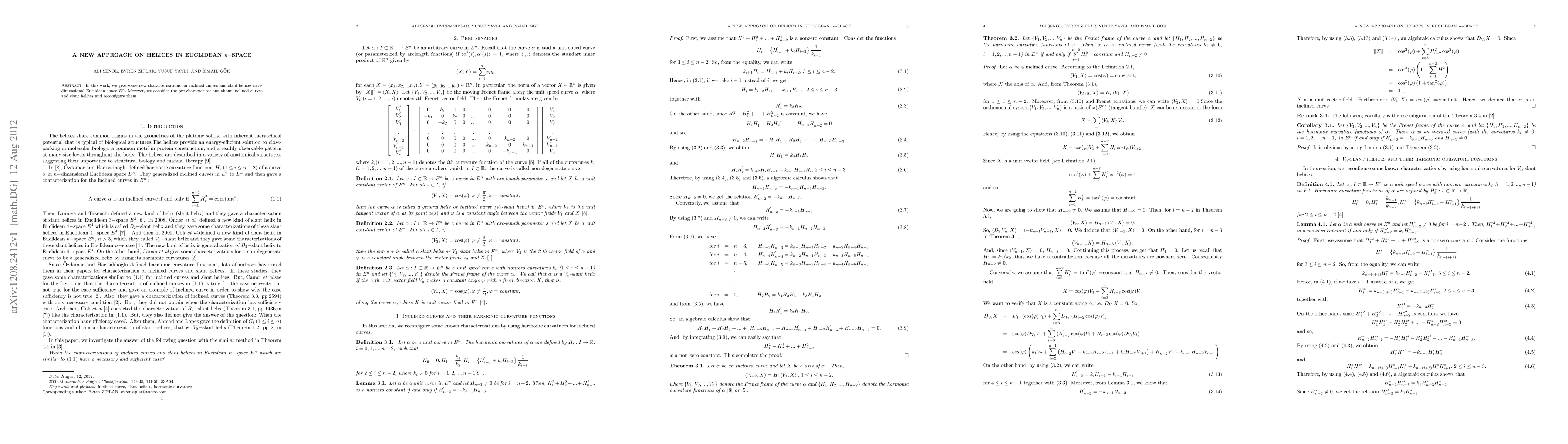 In this work, we give some new characterizations for inclined curves and slant helices in n-dimensional Euclidean space E^{n}. Morever, we consider the pre-characterizations about inclined curves and slant helices and reconfigure them.