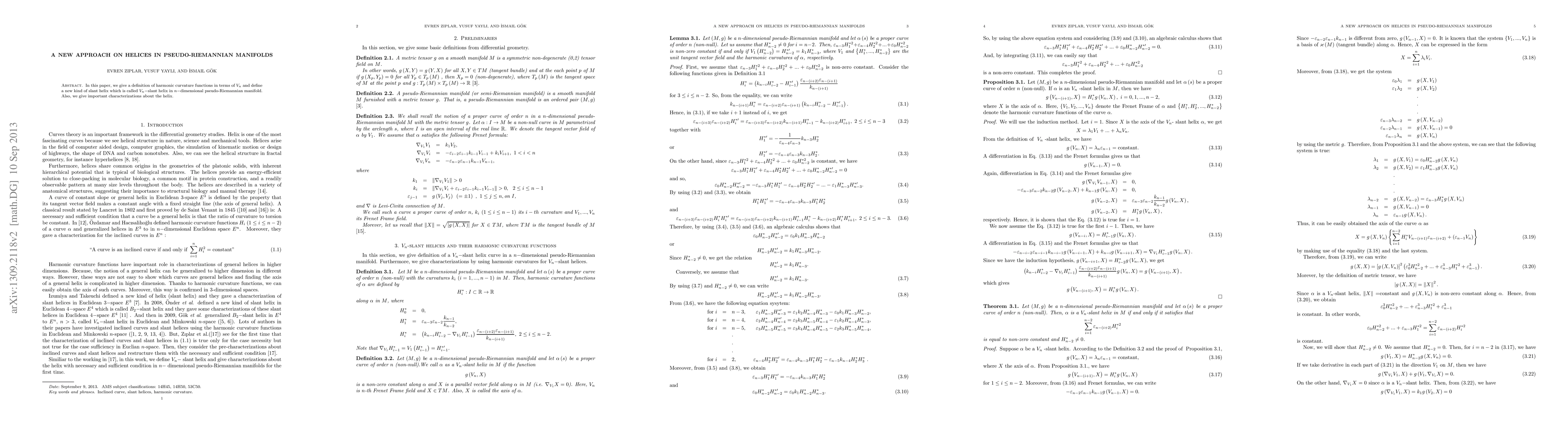 This paper introduces harmonic curvature functions defined via V_{n} and proposes a novel V_{n}-slant helix in n-dimensional pseudo-Riemannian manifolds, along with significant characterizations of this new helix type.