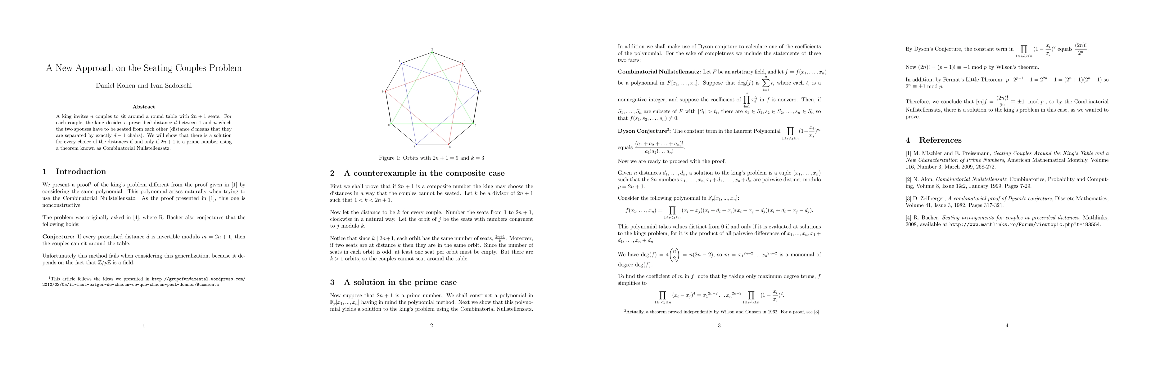 A king invites n couples to sit around a round table with 2n+1 seats. For each couple, the king decides a prescribed distance d between 1 and n which the two spouses have to be seated from each other (distance d means that they are separated by exactly d-1 chairs). We will show that there is a solution for every choice of the distances if and only if 2n+1 is a prime number, using a theorem known as Combinatorial Nullstellensatz.