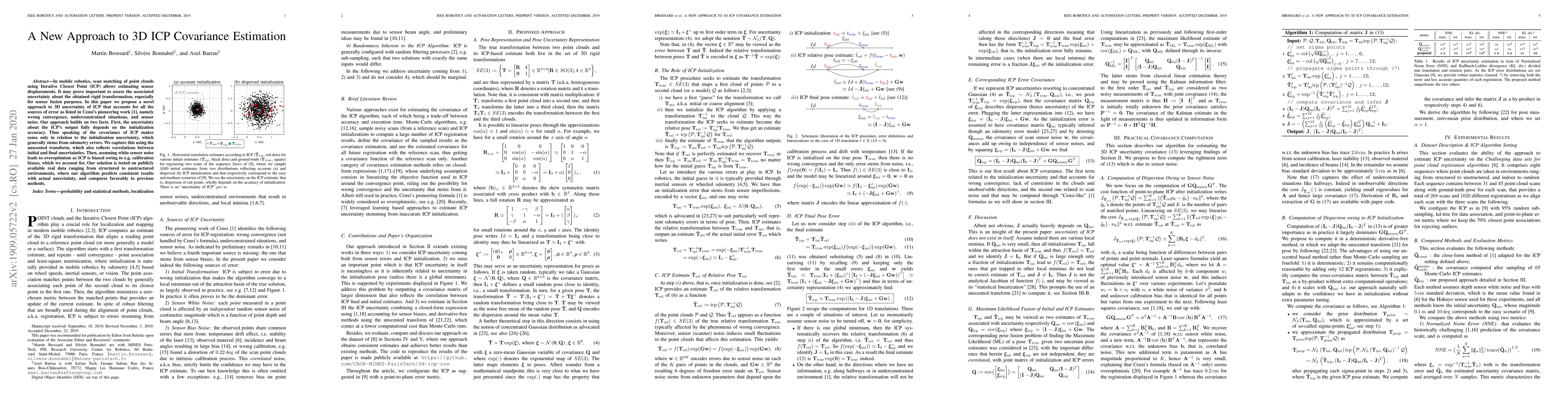 This paper proposes a novel method for estimating 3D covariance in Iterative Closest Point (ICP) scan matching, addressing errors from wrong convergence, underconstrained situations, and sensor noise. It leverages the unscented transform to account for initialization uncertainty, especially odometry errors, and corrects for biases in sensor noise.