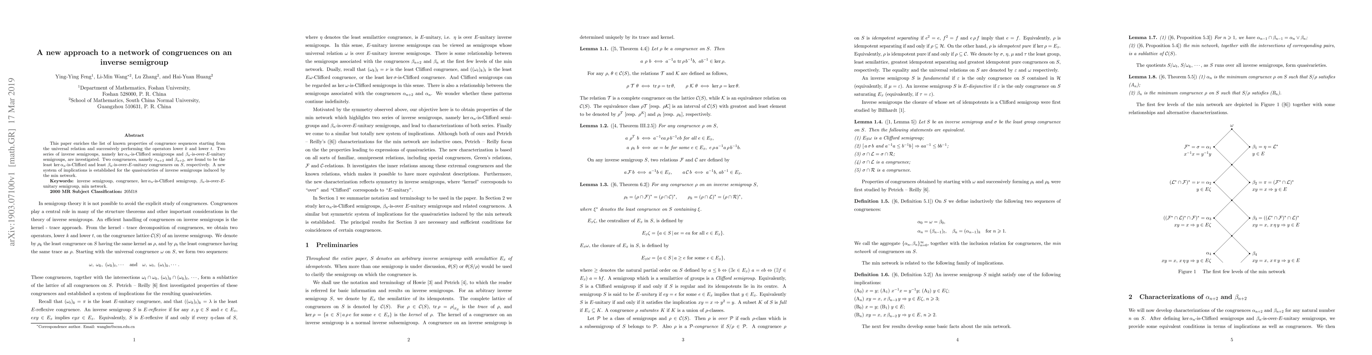 This paper enriches the list of known properties of congruence sequences starting from the universal relation and successively performing the operators lower $k$ and lower $t$. Two series of inverse semigroups, namely $\ker{\alpha_n}$-is-Clifford semigroups and $\beta_n$-is-over-$E$-unitary semigroups, are investigated. Two congruences, namely $\alpha_{n+2}$ and $\beta_{n+2}$, are found to be the least $\ker{\alpha_n}$-is-Clifford and least $\beta_n$-is-over-$E$-unitary congruences on $S$, respectively. A new system of implications is established for the quasivarieties of inverse semigroups induced by the min network.