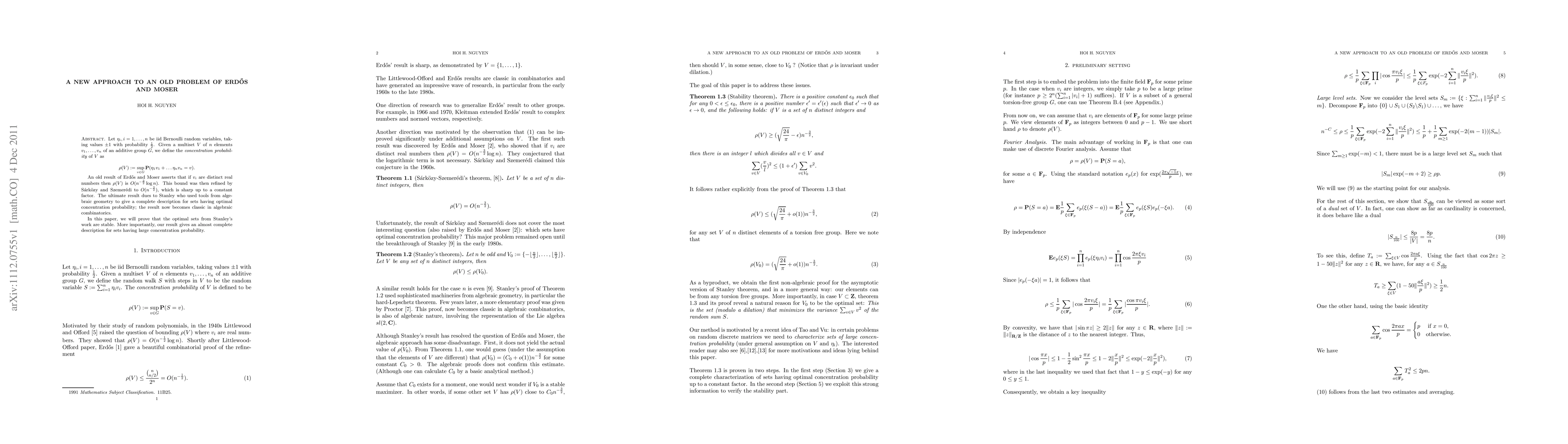 Let $\eta_i, i=1,..., n$ be iid Bernoulli random variables, taking values $\pm 1$ with probability 1/2. Given a multiset $V$ of $n$ elements $v_1, ..., v_n$ of an additive group $G$, we define the \emph{concentration probability} of $V$ as $$\rho(V) := \sup_{v\in G} P(\eta_1 v_1 + ... \eta_n v_n =v). $$ An old result of Erdos and Moser asserts that if $v_i $ are distinct real numbers then $\rho(V)$ is $O(n^{-3/2}\log n)$. This bound was then refined by Sarkozy and Szemeredi to $O(n^{-3/2})$, which is sharp up to a constant factor. The ultimate result dues to Stanley who used tools from algebraic geometry to give a complete description for sets having optimal concentration probability; the result now becomes classic in algebraic combinatorics. In this paper, we will prove that the optimal sets from Stanley's work are stable. More importantly, our result gives an almost complete description for sets having large concentration probability.