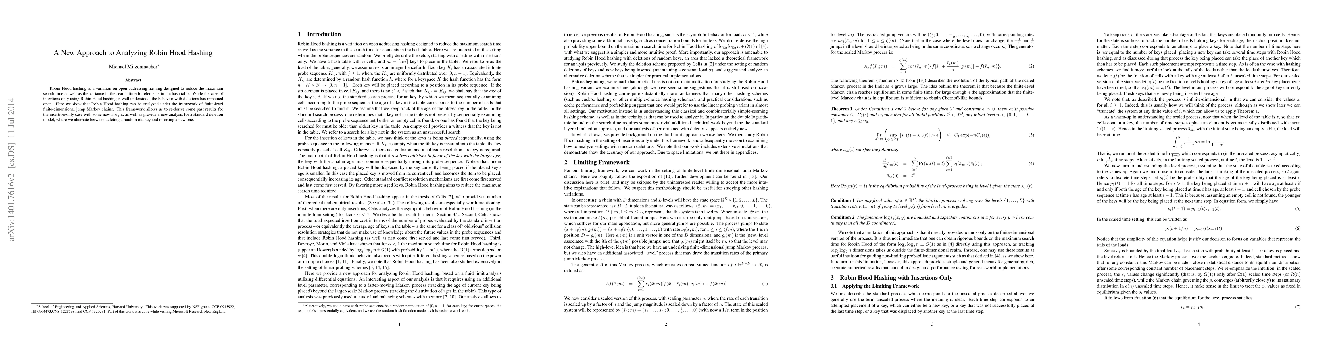 This paper introduces a new analytical framework for Robin Hood hashing, demonstrating its effectiveness in handling deletions through finite-level finite-dimensional jump Markov chains. It provides new insights into the insertion-only behavior and shows that a simple deletion strategy maintains good performance under high load conditions.