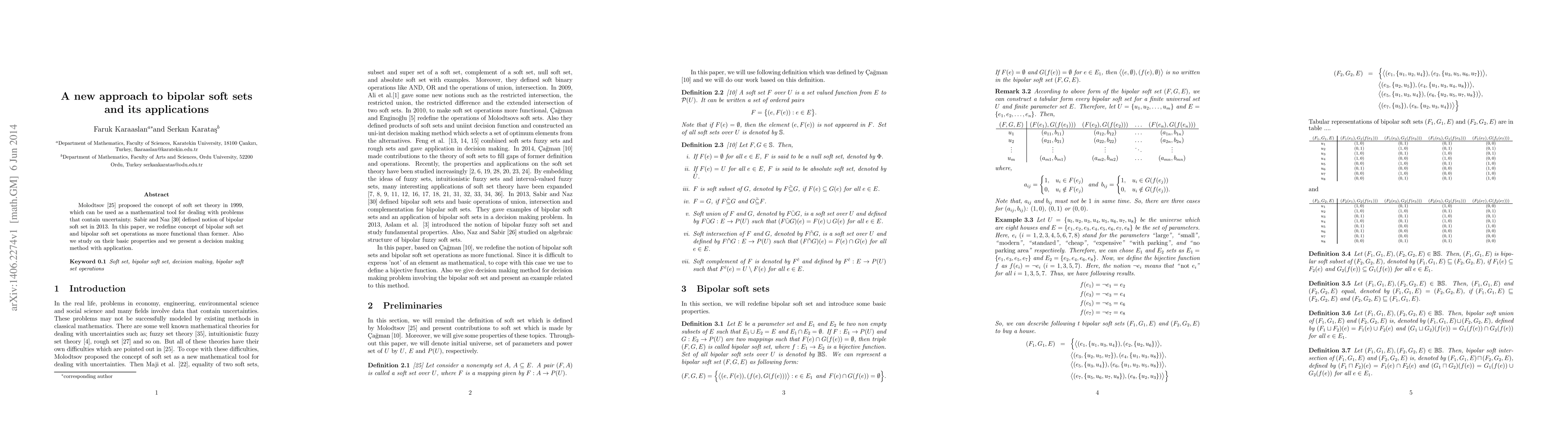 The paper redefines the concept of bipolar soft sets and studies their properties, introducing new operations and presenting a decision-making method based on these sets.