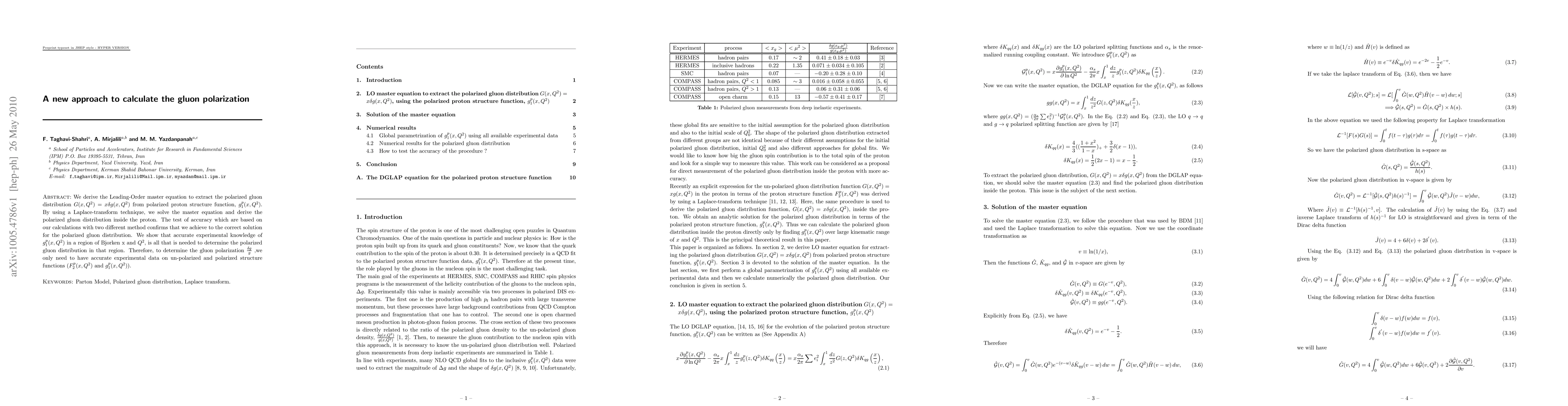 We derive the Leading-Order master equation to extract the polarized gluon distribution G(x;Q^2) = x \deltag(x;Q^2) from polarized proton structure function, g1p(x;Q^2). By using a Laplace-transform technique, we solve the master equation and derive the polarized gluon distribution inside the proton. The test of accuracy which are based on our calculations with two different methods confirms that we achieve to the correct solution for the polarized gluon distribution. We show that accurate experimental knowledge of g1p(x;Q^2) in a region of Bjorken x and Q^2, is all that is needed to determine the polarized gluon distribution in that region. Therefore, to determine the gluon polarization \deltag /g,we only need to have accurate experimental data on un-polarized and polarized structure functions (F2p (x;Q^2) and g1p(x;Q^2)).