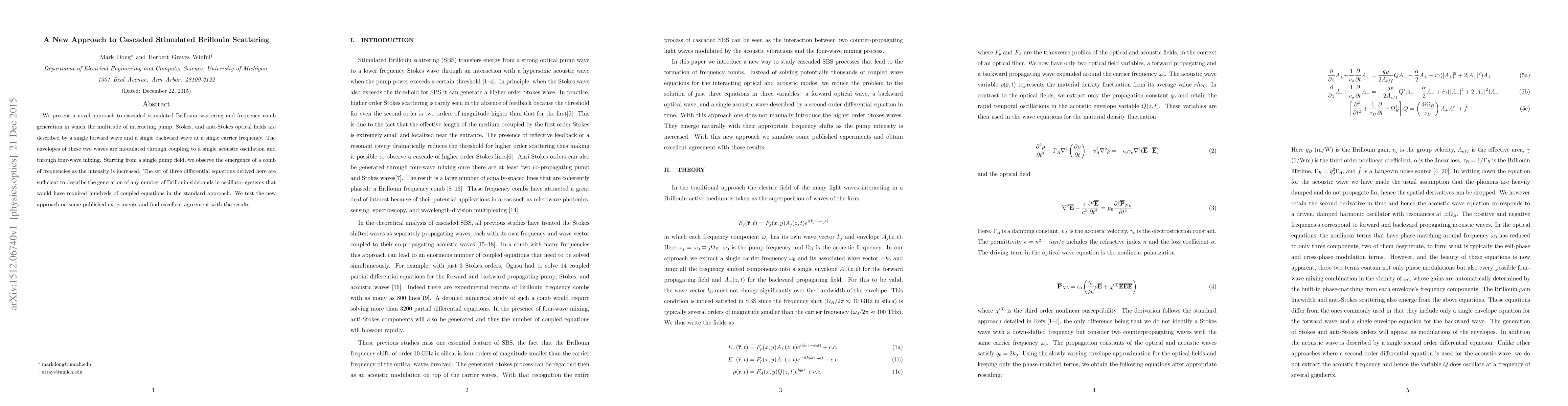 We present a novel approach to cascaded stimulated Brillouin scattering and frequency comb generation in which the multitude of interacting pump, Stokes, and anti-Stokes optical fields are described by a single forward wave and a single backward wave at a single carrier frequency. The envelopes of these two waves are modulated through coupling to a single acoustic oscillation and through four-wave mixing. Starting from a single pump field, we observe the emergence of a comb of frequencies as the intensity is increased. The set of three differential equations derived here are sufficient to describe the generation of any number of Brillouin sidebands in oscillator systems that would have required hundreds of coupled equations in the standard approach. We test the new approach on some published experiments and find excellent agreement with the results.