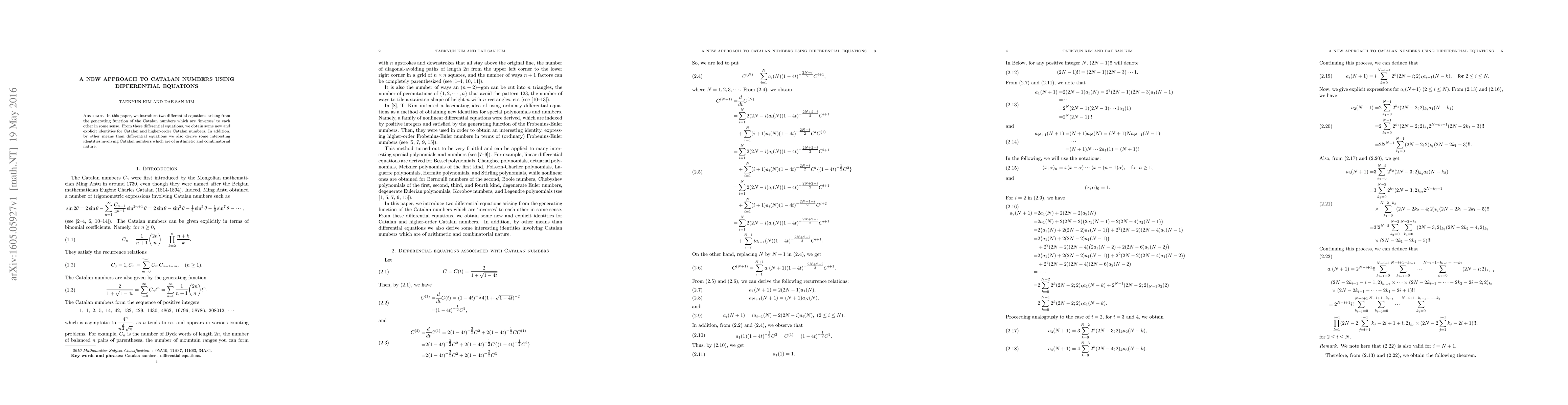 This paper proposes a novel approach to Catalan numbers using differential equations, revealing two interrelated differential equations from their generating function that yield new explicit identities for Catalan and higher-order Catalan numbers, alongside additional combinatorial and arithmetic identities.