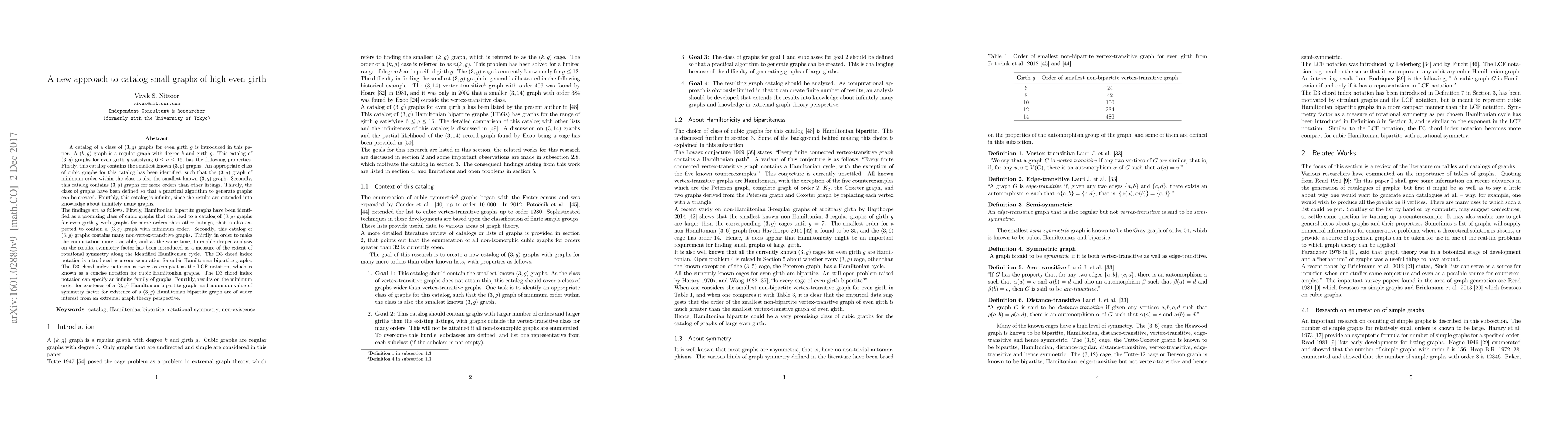 A catalog of a class of (3,g) graphs for even girth g is introduced in this paper. A (k,g) graph is a regular graph with degree k and girth g. This catalog of (3,g) graphs for even girth g satisfying 6 <= g <= 16, has the following properties. Firstly, this catalog contains the smallest known (3, g) graphs. An appropriate class of cubic graphs for this catalog has been identified, such that the (3,g) graph of minimum order within the class is also the smallest known (3,g) graph. Secondly, this catalog contains (3,g) graphs for more orders than other listings. Thirdly, the class of graphs have been defined so that a practical algorithm to generate graphs can be created. Fourthly, this catalog is infinite, since the results are extended into knowledge about infinitely many graphs. The findings are as follows. Firstly, Hamiltonian bipartite graphs have been identified as a promising class of cubic graphs that can lead to a catalog of (3,g) graphs for even girth g with graphs for more orders than other listings, that is also expected to contain a (3,g) graph with minimum order. Secondly, this catalog of (3,g) graphs contains many non-vertex-transitive graphs. Thirdly, in order to make the computation more tractable, and at the same time, to enable deeper analysis on the results, symmetry factor has been introduced as a measure of the extent of rotational symmetry along the identified Hamiltonian cycle. The D3 chord index notation is introduced as a concise notation for cubic Hamiltonian bipartite graphs. The D3 chord index notation is twice as compact as the LCF notation. The D3 chord index notation can specify an infinite family of graphs. Fourthly, results on the minimum order for existence of a (3,g) Hamiltonian bipartite graph, and minimum value of symmetry factor for existence of a (3,g) Hamiltonian bipartite graph are of wider interest.