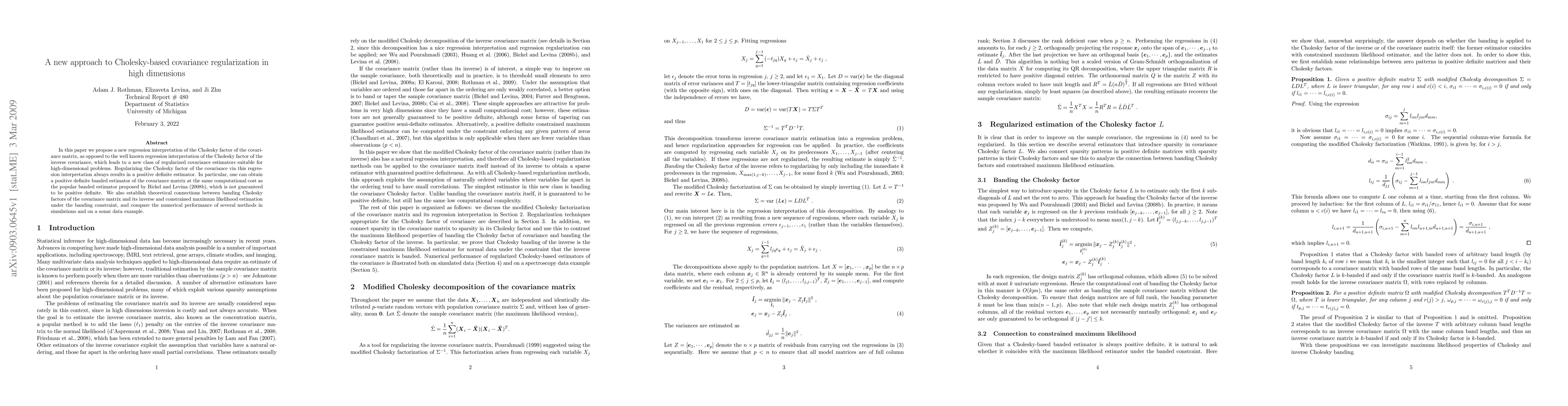 In this paper we propose a new regression interpretation of the Cholesky factor of the covariance matrix, as opposed to the well known regression interpretation of the Cholesky factor of the inverse covariance, which leads to a new class of regularized covariance estimators suitable for high-dimensional problems. Regularizing the Cholesky factor of the covariance via this regression interpretation always results in a positive definite estimator. In particular, one can obtain a positive definite banded estimator of the covariance matrix at the same computational cost as the popular banded estimator proposed by Bickel and Levina (2008b), which is not guaranteed to be positive definite. We also establish theoretical connections between banding Cholesky factors of the covariance matrix and its inverse and constrained maximum likelihood estimation under the banding constraint, and compare the numerical performance of several methods in simulations and on a sonar data example.