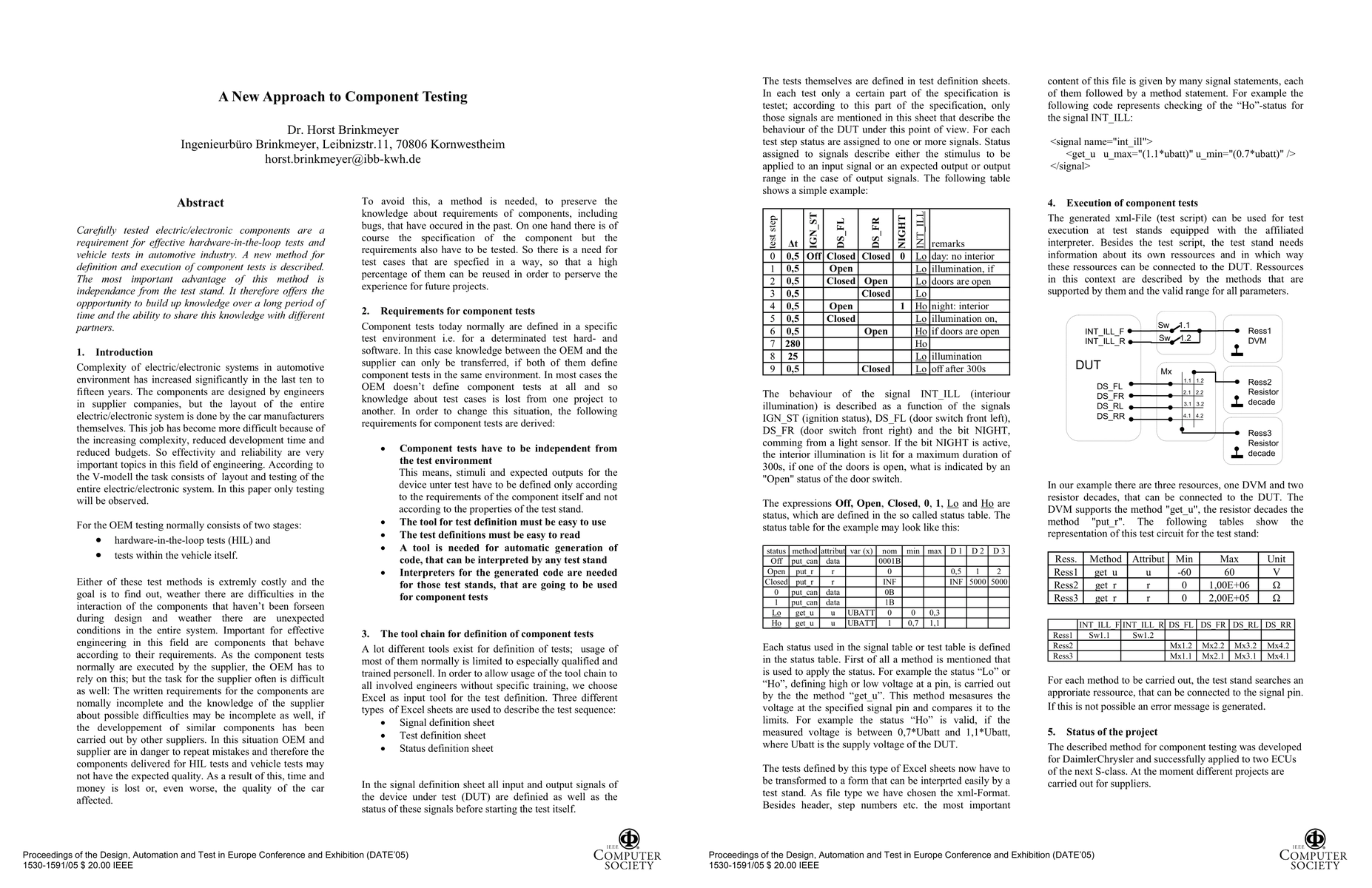 Carefully tested electric/electronic components are a requirement for effective hardware-in-the-loop tests and vehicle tests in automotive industry. A new method for definition and execution of component tests is described. The most important advantage of this method is independance from the test stand. It therefore offers the oppportunity to build up knowledge over a long period of time and the ability to share this knowledge with different partners.