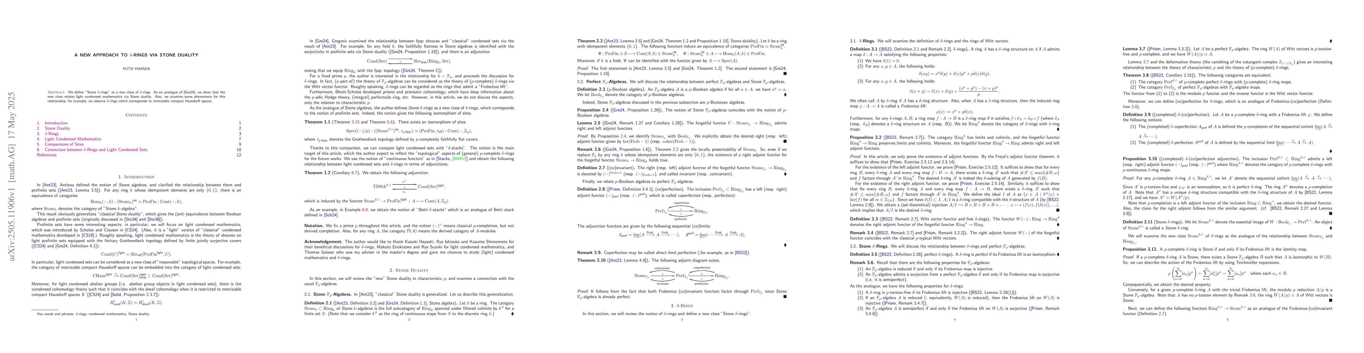 The paper introduces Stone $\delta$-rings as a novel class of $\delta$-rings, utilizing Stone duality to establish a relationship with light condensed mathematics developed by Clausen-Scholze.