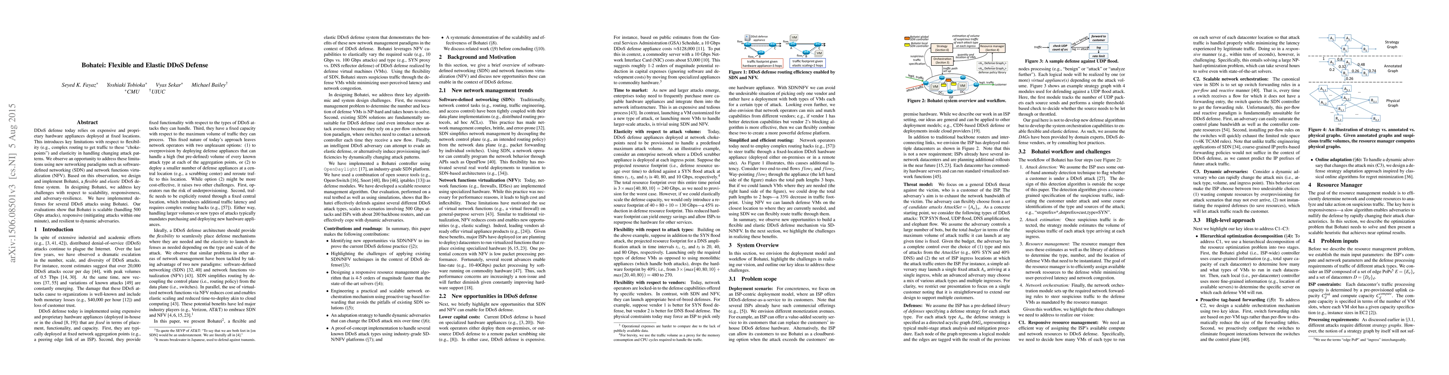 Networks today rely on expensive and proprietary hard- ware appliances, which are deployed at fixed locations, for DDoS defense. This introduces key limitations with respect to flexibility (e.g., complex routing to get traffic to these "chokepoints") and elasticity in handling changing attack patterns. We observe an opportunity to ad- dress these limitations using new networking paradigms such as software-defined networking (SDN) and network functions virtualization (NFV). Based on this observation, we design and implement of Bohatei, an elastic and flexible DDoS defense system. In designing Bohatei, we address key challenges of scalability, responsive- ness, and adversary-resilience. We have implemented defenses for several well-known DDoS attacks in Bohatei. Our evaluations show that Bohatei is scalable (handling 500 Gbps attacks), responsive (mitigating attacks within one minute), and resilient to dynamic adversaries.