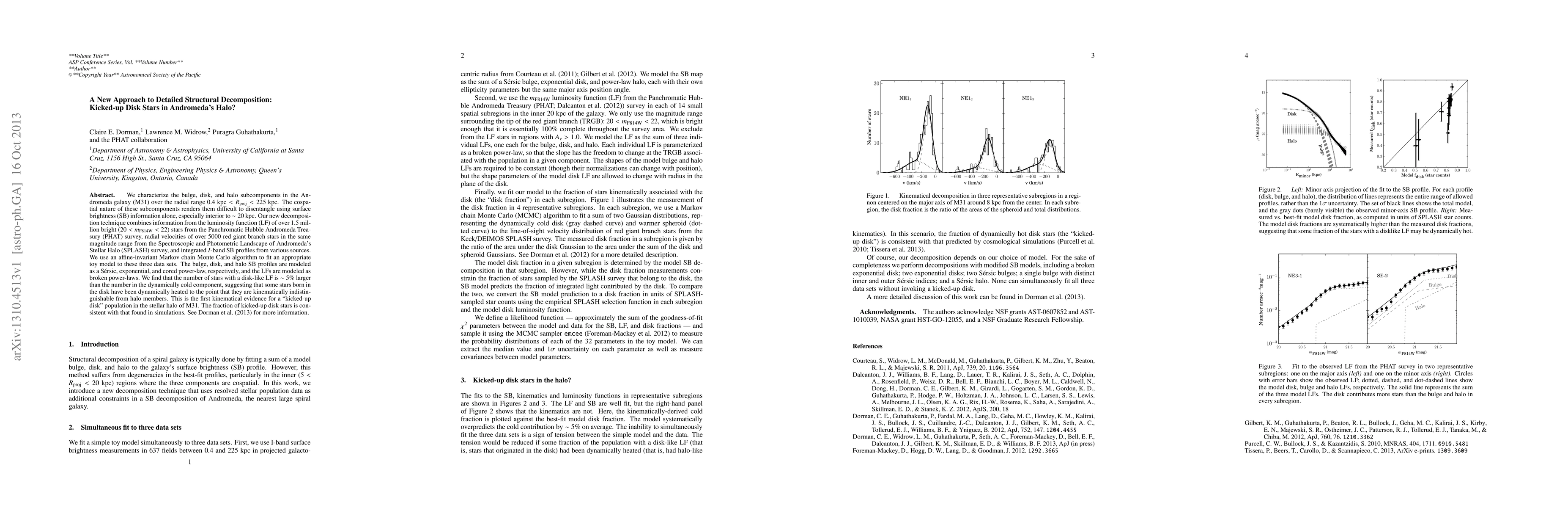 We characterize the bulge, disk, and halo subcomponents in the Andromeda galaxy (M31) over the radial range 0.4 < R < 225 kpc. The cospatial nature of these subcomponents renders them difficult to disentangle using surface brightness (SB) information alone, especially interior to ~20 kpc. Our new decomposition technique combines information from the luminosity function (LF) of over 1.5 million bright (20 < I < 22) stars from the Panchromatic Hubble Andromeda Treasury (PHAT) survey, radial velocities of over 5000 red giant branch stars in the same magnitude range from the Spectroscopic and Photometric Landscape of Andromeda's Stellar Halo (SPLASH) survey, and integrated I-band SB profiles from various sources. We use an affine-invariant Markov chain Monte Carlo algorithm to fit an appropriate toy model to these three data sets. The bulge, disk, and halo SB profiles are modeled as a Sersic, exponential, and cored power-law, respectively, and the LFs are modeled as broken power-laws. We find that the number of stars with a disk-like LF is ~5% larger than the number in the dynamically cold component, suggesting that some stars born in the disk have been dynamically heated to the point that they are kinematically indistinguishable from halo members. This is the first kinematical evidence for a "kicked-up disk" population in the stellar halo of M31. The fraction of kicked-up disk stars is consistent with that found in simulations. See Dorman et al. (2013, submitted) for more information.