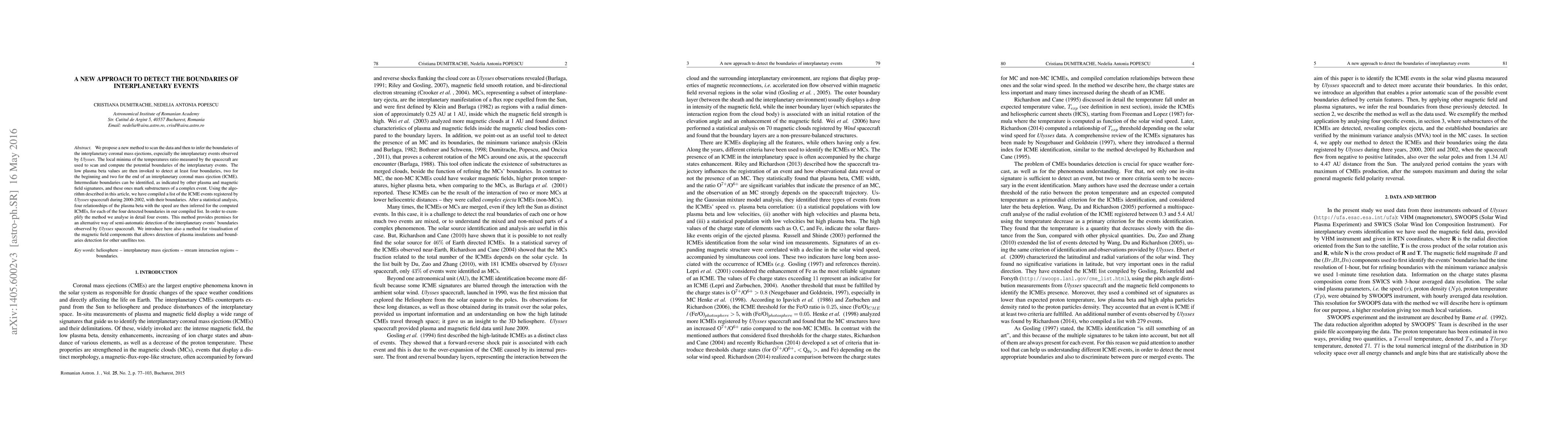 A new method detects boundaries of interplanetary coronal mass ejections using temperature ratio minima and plasma beta values, providing an alternative semi-automatic detection approach for Ulysses spacecraft data.