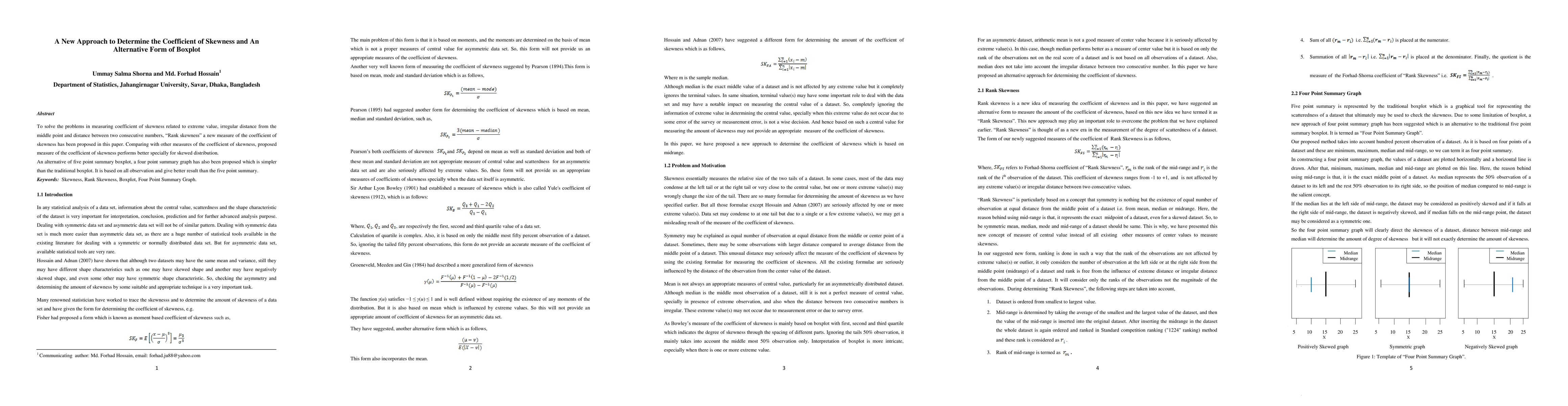 This paper introduces 'Rank Skewness', a new method to measure skewness addressing issues with extreme values and irregular distances. It also proposes a simplified four-point summary graph, an alternative to the traditional five-point boxplot, offering better results.