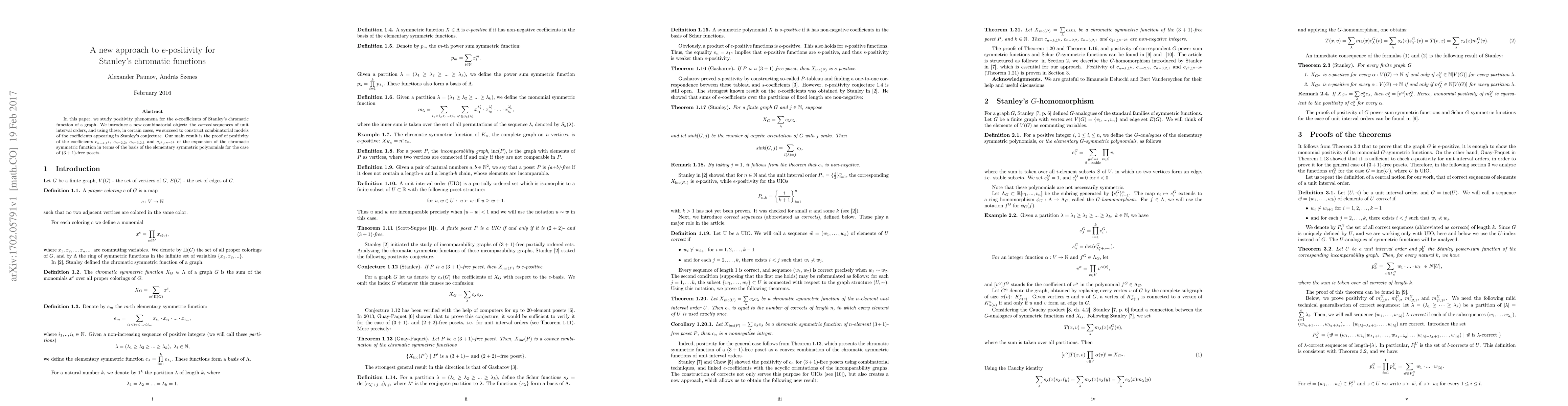 In this paper, we study positivity phenomena for the $e$-coefficients of Stanley's chromatic function of a graph. We introduce a new combinatorial object: the {\em correct} sequences of unit interval orders, and using these, in certain cases, we succeed to construct combinatorial models of the coefficients appearing in Stanley's conjecture. Our main result is the proof of positivity of the coefficients $c_{n-k,1^k}$, $c_{n-2,2}$, $c_{n-3,2,1}$ and $c_{2^k,1^{n-2k}}$ of the expansion of the chromatic symmetric function in terms of the basis of the elementary symmetric polynomials for the case of $(3+1)$-free posets.