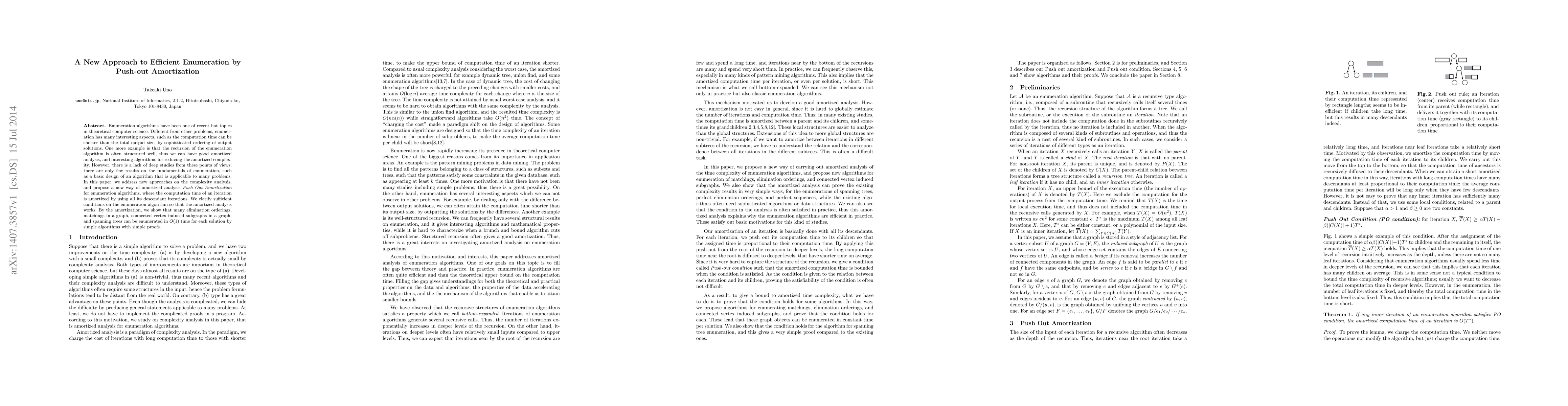 Enumeration algorithms have been one of recent hot topics in theoretical computer science. Different from other problems, enumeration has many interesting aspects, such as the computation time can be shorter than the total output size, by sophisticated ordering of output solutions. One more example is that the recursion of the enumeration algorithm is often structured well, thus we can have good amortized analysis, and interesting algorithms for reducing the amortized complexity. However, there is a lack of deep studies from these points of views; there are only few results on the fundamentals of enumeration, such as a basic design of an algorithm that is applicable to many problems. In this paper, we address new approaches on the complexity analysis, and propose a new way of amortized analysis Push-Out Amortization for enumeration algorithms, where the computation time of an iteration is amortized by using all its descendant iterations. We clarify sufficient conditions on the enumeration algorithm so that the amortized analysis works. By the amortization, we show that many elimination orderings, matchings in a graph, connected vertex induced subgraphs in a graph, and spanning trees can be enumerated in O(1) time for each solution by simple algorithms with simple proofs.