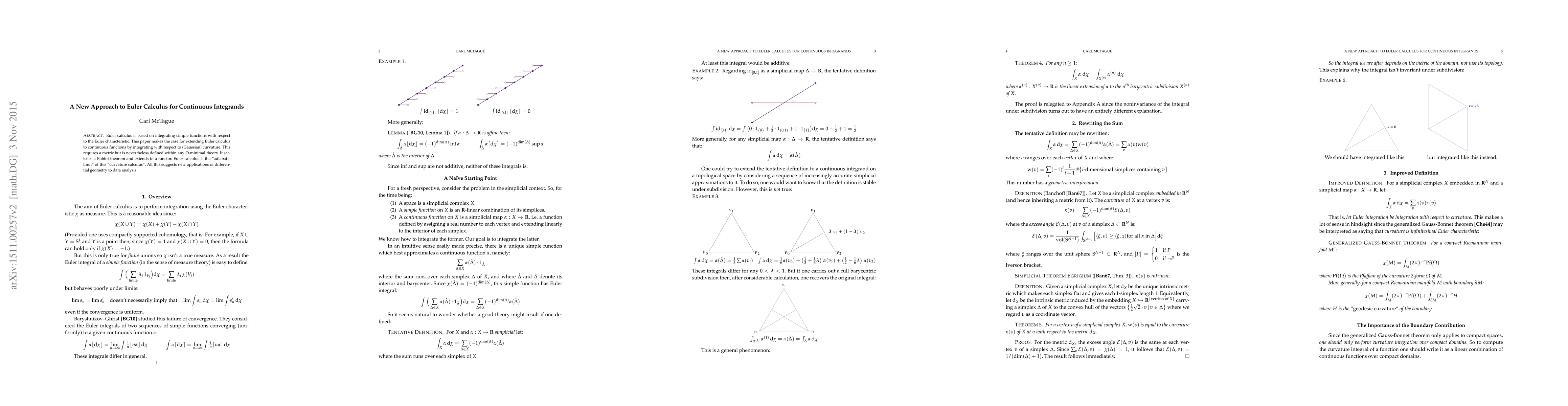 This paper proposes extending Euler calculus to continuous integrands by integrating with respect to Gaussian curvature, introducing a new "curvature calculus" that satisfies a Fubini theorem and extends to a functor, suggesting new applications of differential geometry to data analysis.