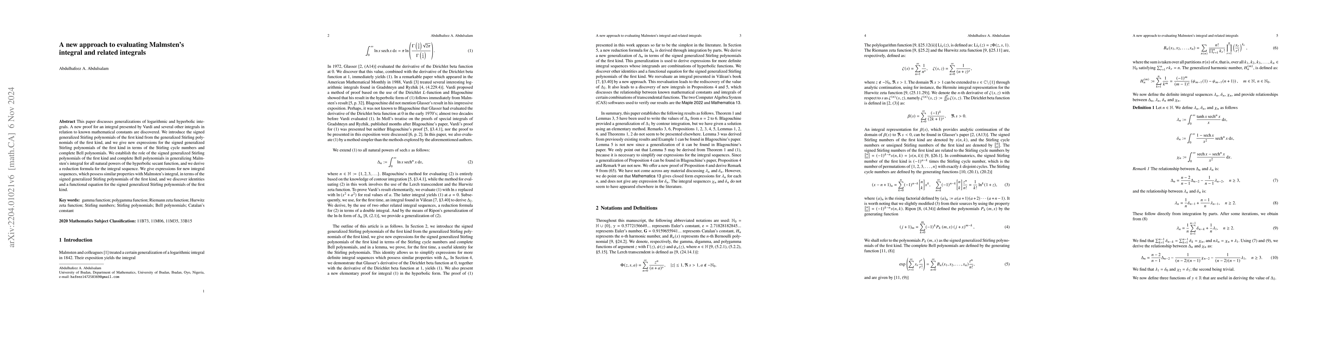 This paper discusses generalizations of logarithmic and hyperbolic integrals. A new proof for an integral presented by Vardi and several other integrals in relation to known mathematical constants are discovered. We introduce the signed generalized Stirling polynomials from the generalized Stirling polynomials, and we give new expressions for the signed generalized Stirling polynomials in terms of the Stirling cycle numbers and complete Bell polynomials. We establish the role of the signed generalized Stirling polynomials and complete Bell polynomials in generalizing Malmsten's integral for all natural powers of the hyperbolic secant function, and we derive a reduction formula for the integral sequence. We give expressions for new integral sequences, which possess similar properties with Malmsten's integral, in terms of the signed generalized Stirling polynomials, and we discover identities and a functional equation for the signed generalized Stirling polynomials. Several finite sums involving the signed generalized Stirling polynomials and Hurwitz zeta function are also expressed in terms of known mathematical constants.