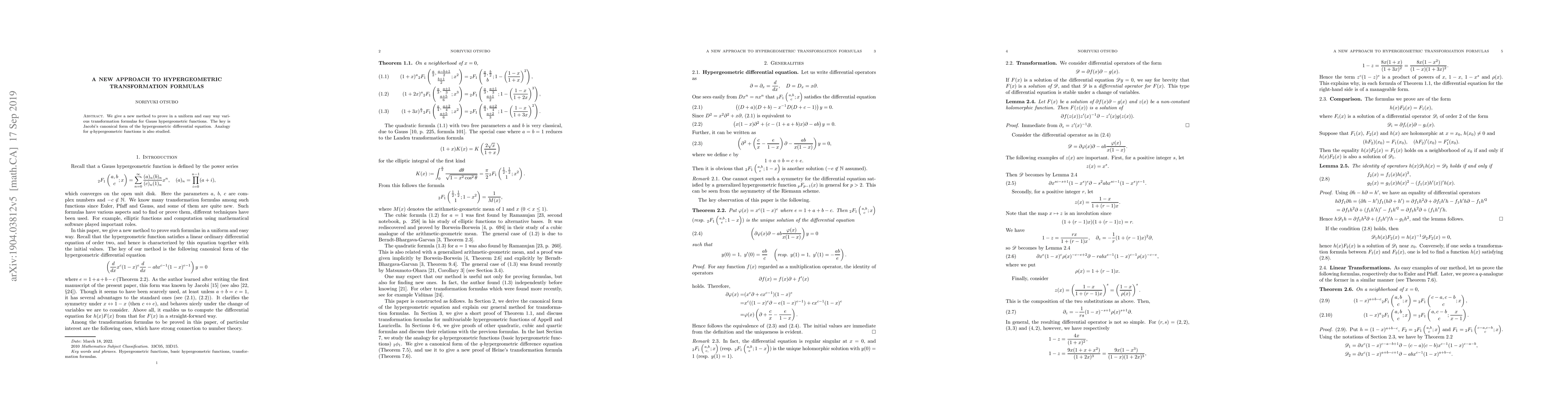 We give a new method to prove in a uniform and easy way various transformation formulas for Gauss hypergeometric functions. The key is Jacobi's canonical form of the hypergeometric differential equation. Analogy for $q$-hypergeometric functions is also studied.
