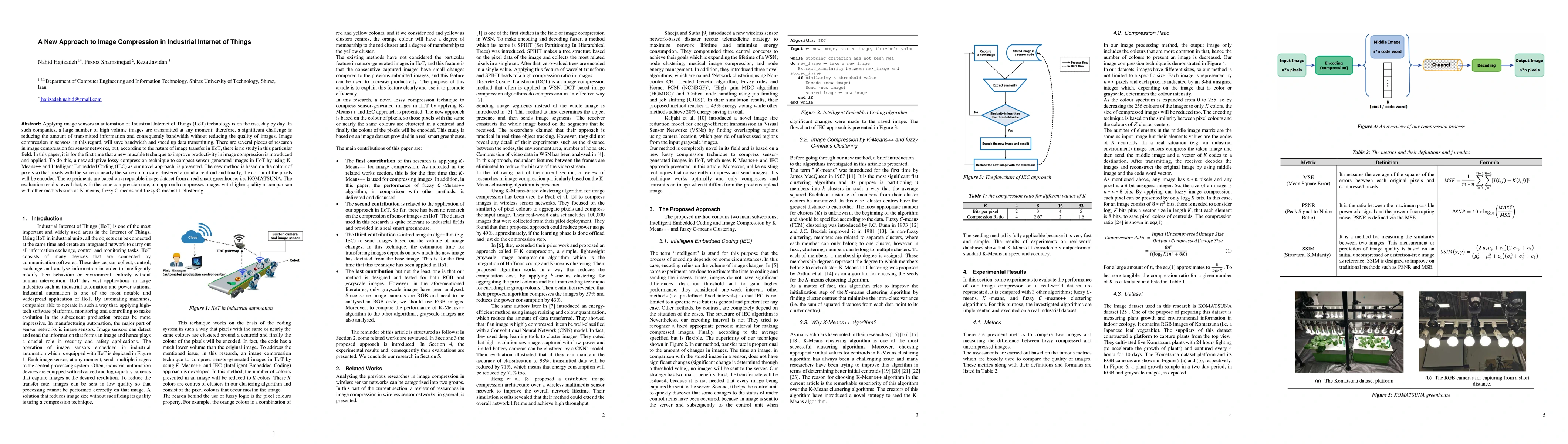 Applying image sensors in automation of Industrial Internet of Things (IIoT) technology is on the rise, day by day. In such companies, a large number of high volume images are transmitted at any moment; therefore, a significant challenge is reducing the amount of transmitted information and consequently bandwidth without reducing the quality of images. Image compression in sensors, in this regard, will save bandwidth and speed up data transmitting. There are several pieces of research in image compression for sensor networks, but, according to the nature of image transfer in IIoT, there is no study in this particular field. In this paper, it is for the first time that a new reusable technique to improve productivity in image compression is introduced and applied. To do this, a new adaptive lossy compression technique to compact sensor-generated images in IIoT by using K- Means++ and Intelligent Embedded Coding (IEC) as our novel approach, is presented. The new method is based on the colour of pixels so that pixels with the same or nearly the same colours are clustered around a centroid and finally, the colour of the pixels will be encoded. The experiments are based on a reputable image dataset from a real smart greenhouse; i.e. KOMATSUNA. The evaluation results reveal that, with the same compression rate, our approach compresses images with higher quality in comparison with other methods such as K-means, fuzzy C-means and fuzzy C-means++ clustering.