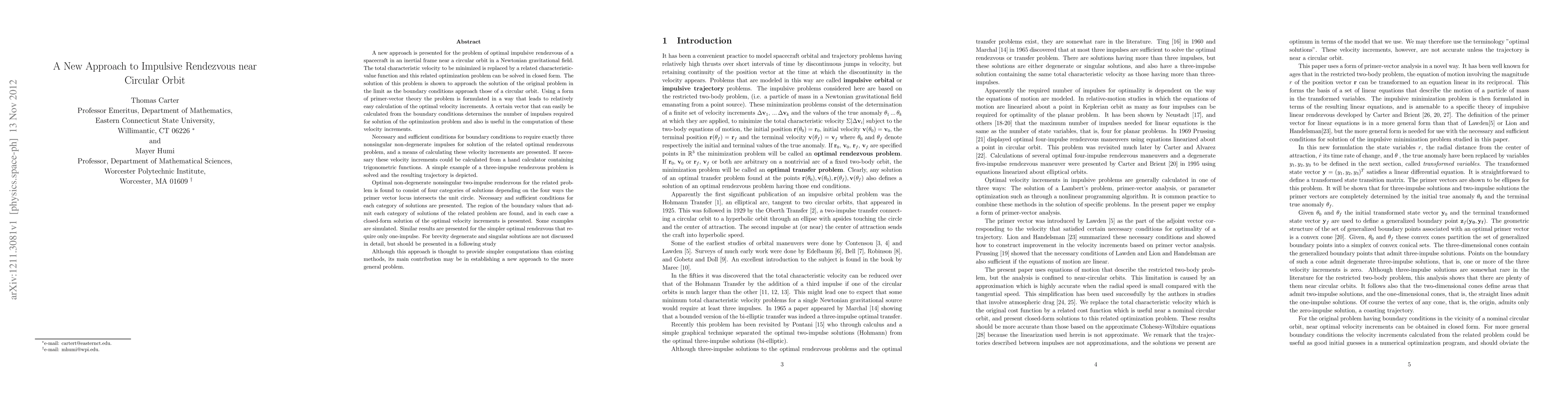 A new approach is presented for the problem of optimal impulsive rendezvous of a spacecraft in an inertial frame near a circular orbit in a Newtonian gravitational field. The total characteristic velocity to be minimized is replaced by a related characteristic-value function and this related optimization problem can be solved in closed form. The solution of this problem is shown to approach the solution of the original problem in the limit as the boundary conditions approach those of a circular orbit. Using a form of primer-vector theory the problem is formulated in a way that leads to relatively easy calculation of the optimal velocity increments. A certain vector that can easily be calculated from the boundary conditions determines the number of impulses required for solution of the optimization problem and also is useful in the computation of these velocity increments. Necessary and sufficient conditions for boundary conditions to require exactly three nonsingular non-degenerate impulses for solution of the related optimal rendezvous problem, and a means of calculating these velocity increments are presented. If necessary these velocity increments could be calculated from a hand calculator containing trigonometric functions. A simple example of a three-impulse rendezvous problem is solved and the resulting trajectory is depicted.