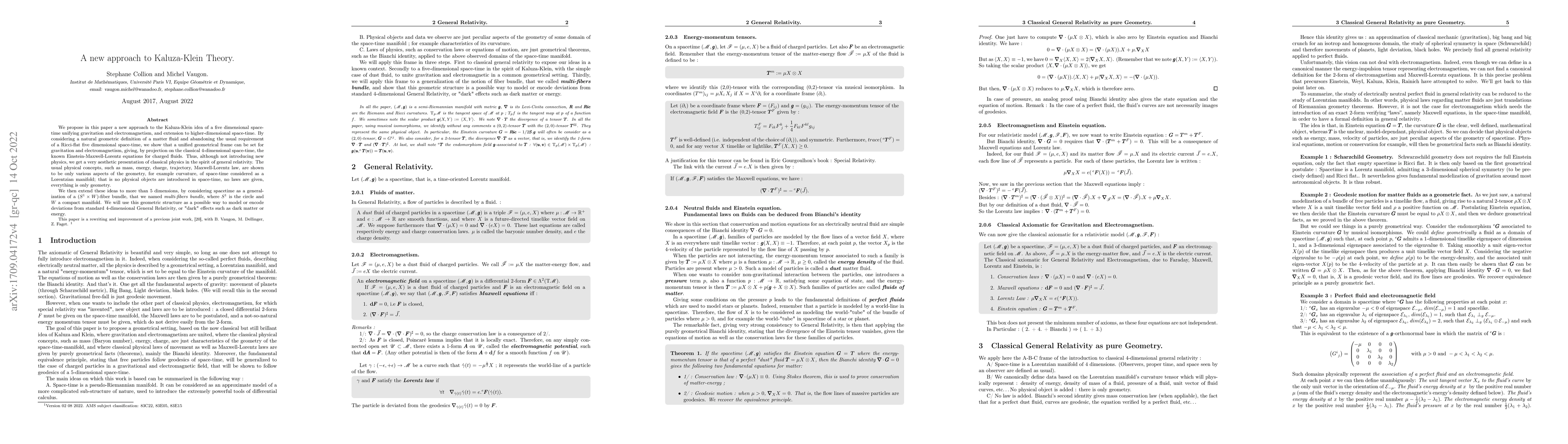 We propose in this paper a new approach to the Kaluza-Klein idea of a five dimensional space-time unifying gravitation and electromagnetism, and extension to higher-dimensional space-time. By considering a natural geometric definition of a matter fluid and abandoning the usual requirement of a Ricci-flat five dimensional space-time, we show that a unified geometrical frame can be set for gravitation and electromagnetism, giving, by projection on the classical 4-dimensional space-time, the known Einstein-Maxwell-Lorentz equations for charged fluids. Thus, although not introducing new physics, we get a very aesthetic presentation of classical physics in the spirit of general relativity. The usual physical concepts, such as mass, energy, charge, trajectory, Maxwell-Lorentz law, are shown to be only various aspects of the geometry, for example curvature, of space-time considered as a Lorentzian manifold; that is no physical objects are introduced in space-time, no laws are given, everything is only geometry. We then extend these ideas to more than 5 dimensions, by considering spacetime as a generalization of a $(S^1\times W)$-fiber bundle, that we named multi-fibers bundle, where $S^1$ is the circle and $W$ a compact manifold. We will use this geometric structure as a possible way to model or encode deviations from standard 4-dimensional General Relativity, or "dark" effects such as dark matter or energy.