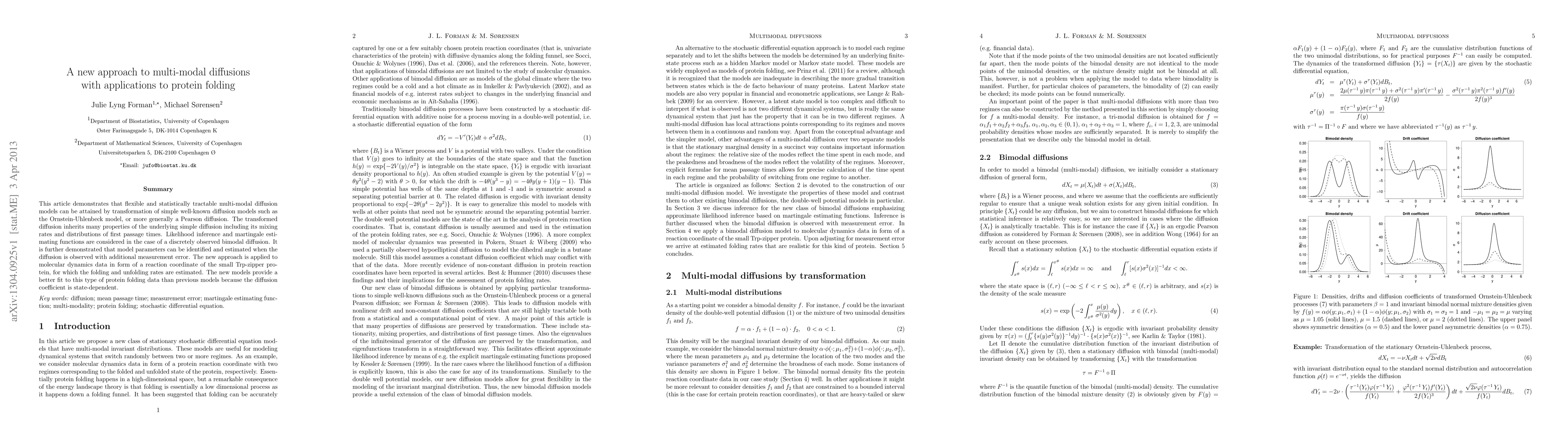 This article demonstrates that flexible and statistically tractable multi-modal diffusion models can be attained by transformation of simple well-known diffusion models such as the Ornstein-Uhlenbeck model, or more generally a Pearson diffusion. The transformed diffusion inherits many properties of the underlying simple diffusion including its mixing rates and distributions of first passage times. Likelihood inference and martingale estimating functions are considered in the case of a discretely observed bimodal diffusion. It is further demonstrated that model parameters can be identified and estimated when the diffusion is observed with additional measurement error. The new approach is applied to molecular dynamics data in form of a reaction coordinate of the small Trp-zipper protein, for which the folding and unfolding rates are estimated. The new models provide a better fit to this type of protein folding data than previous models because the diffusion coefficient is state-dependent.