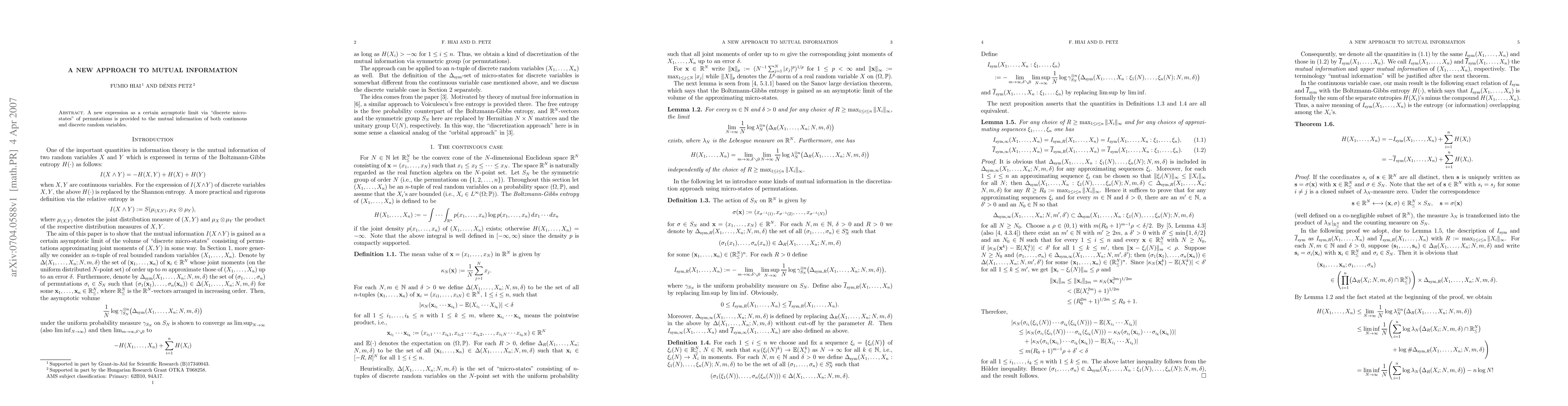 A new expression as a certain asymptotic limit via "discrete micro-states" of permutations is provided to the mutual information of both continuous and discrete random variables.