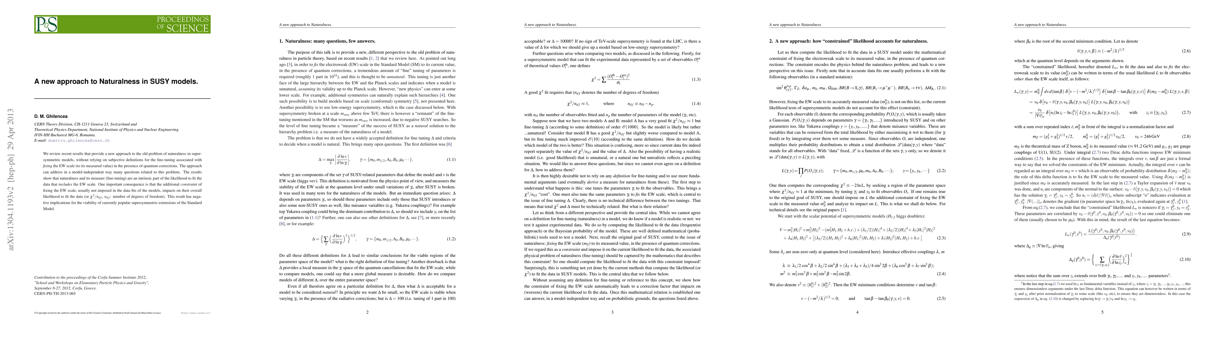 We review recent results that provide a new approach to the old problem of naturalness in supersymmetric models, without relying on subjective definitions for the fine-tuning associated with {\it fixing} the EW scale (to its measured value) in the presence of quantum corrections. The approach can address in a model-independent way many questions related to this problem. The results show that naturalness and its measure (fine-tuning) are an intrinsic part of the likelihood to fit the data that {\it includes} the EW scale. One important consequence is that the additional {\it constraint} of fixing the EW scale, usually not imposed in the data fits of the models, impacts on their overall likelihood to fit the data (or chi^2/ndf, ndf: number of degrees of freedom). This has negative implications for the viability of currently popular supersymmetric extensions of the Standard Model.