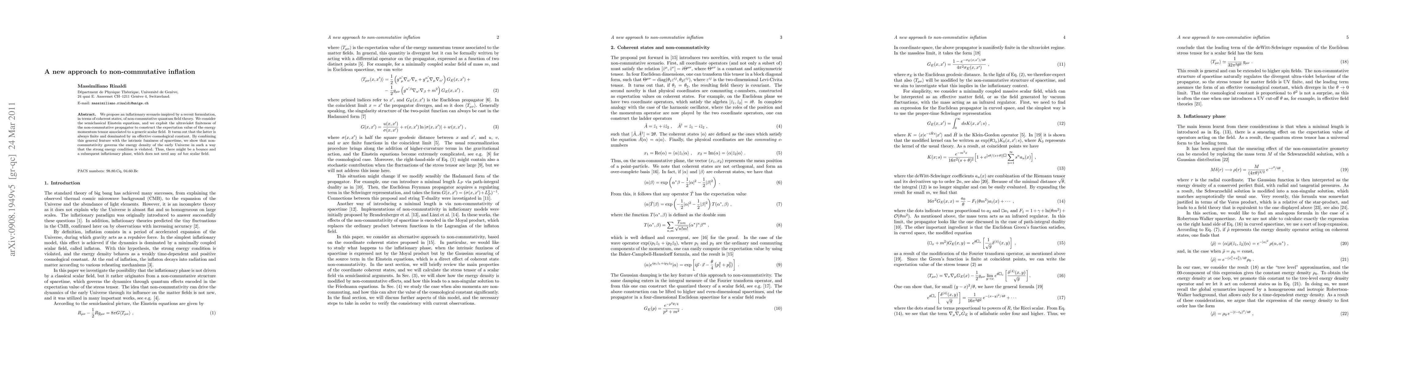 We propose an inflationary scenario inspired by a recent formulation, in terms of coherent states, of non-commutative quantum field theory. We consider the semiclassical Einstein equations, and we exploit the ultraviolet finiteness of the non-commutative propagator to construct the expectation value of the energy momentum tensor associated to a generic scalar field. It turns out that the latter is always finite and dominated by an effective cosmological constant. By combining this general feature with the intrinsic fuzziness of spacetime, we show that non-commutativity governs the energy density of the early Universe in such a way that the strong energy condition is violated. Thus, there might be a bounce and a subsequent inflationary phase, which does not need any \emph{ad hoc} scalar field.