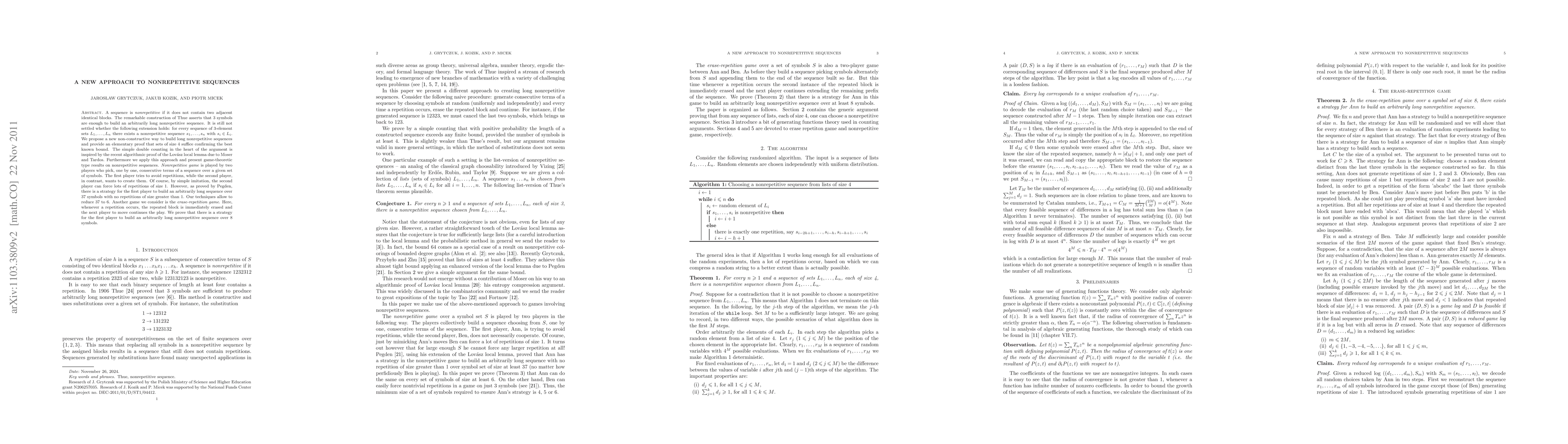 A sequence is nonrepetitive if it does not contain two adjacent identical blocks. The remarkable construction of Thue asserts that 3 symbols are enough to build an arbitrarily long nonrepetitive sequence. It is still not settled whether the following extension holds: for every sequence of 3-element sets $L_1,..., L_n$ there exists a nonrepetitive sequence $s_1, ..., s_n$ with $s_i\in L_i$. Applying the probabilistic method one can prove that this is true for sufficiently large sets $L_i$. We present an elementary proof that sets of size 4 suffice (confirming the best known bound). The argument is a simple counting with Catalan numbers involved. Our approach is inspired by a new algorithmic proof of the Lov\'{a}sz Local Lemma due to Moser and Tardos and its interpretations by Fortnow and Tao. The presented method has further applications to nonrepetitive games and nonrepetitive colorings of graphs.