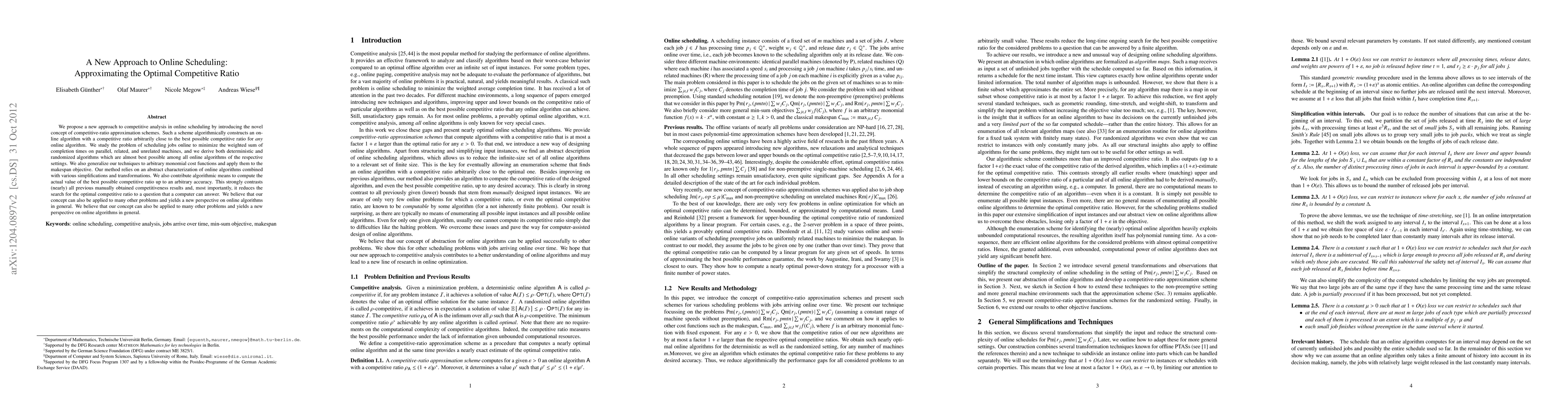 This paper introduces a new competitive-ratio approximation scheme for online scheduling, developing algorithms that nearly achieve the optimal competitive ratio for minimizing weighted completion times on parallel machines. The authors provide both deterministic and randomized algorithms and generalize their techniques to various cost functions, marking a significant advancement in automated competitiveness analysis.