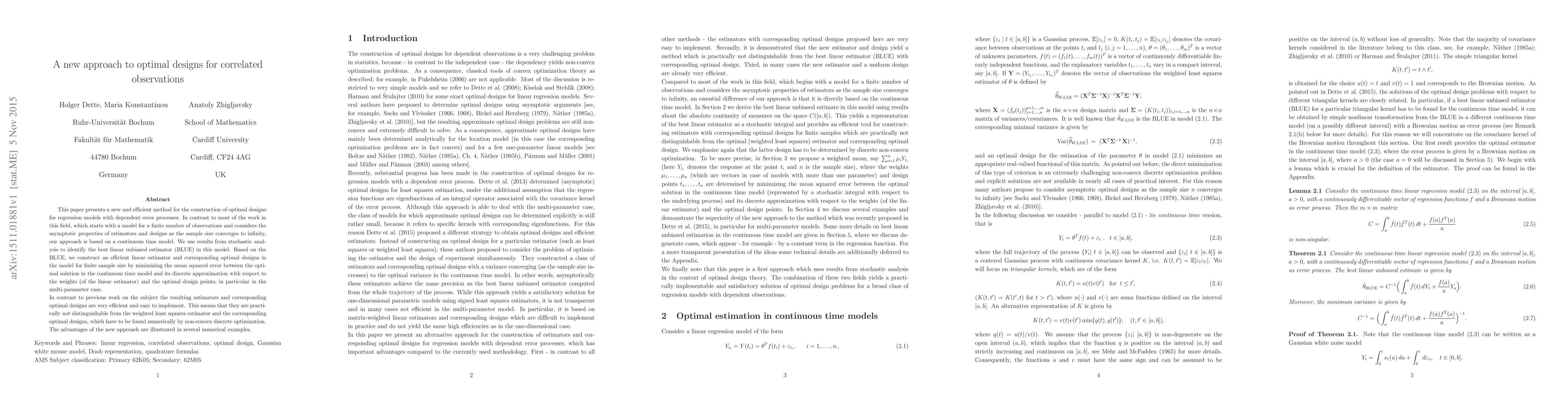 This paper presents a new and efficient method for the construction of optimal designs for regression models with dependent error processes. In contrast to most of the work in this field, which starts with a model for a finite number of observations and considers the asymptotic properties of estimators and designs as the sample size converges to infinity, our approach is based on a continuous time model. We use results from stochastic anal- ysis to identify the best linear unbiased estimator (BLUE) in this model. Based on the BLUE, we construct an efficient linear estimator and corresponding optimal designs in the model for finite sample size by minimizing the mean squared error between the opti- mal solution in the continuous time model and its discrete approximation with respect to the weights (of the linear estimator) and the optimal design points, in particular in the multi-parameter case. In contrast to previous work on the subject the resulting estimators and corresponding optimal designs are very efficient and easy to implement. This means that they are practi- cally not distinguishable from the weighted least squares estimator and the corresponding optimal designs, which have to be found numerically by non-convex discrete optimization. The advantages of the new approach are illustrated in several numerical examples.