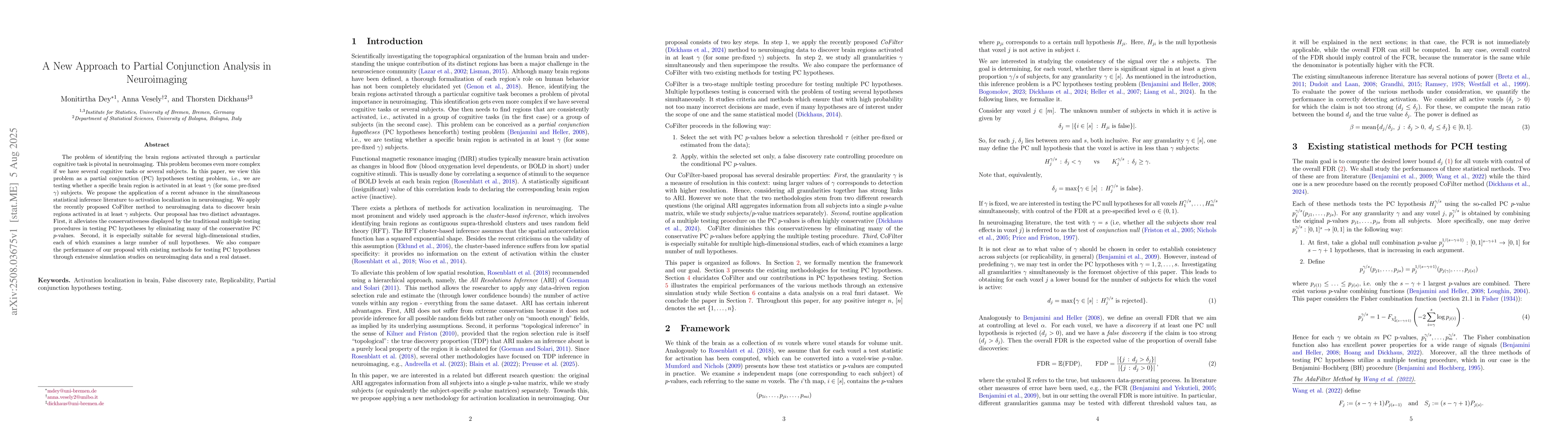 The paper proposes a new approach to partial conjunction (PC) hypotheses testing in neuroimaging using the CoFilter method, which alleviates conservativeness and is suitable for high-dimensional studies. It involves fixing a threshold τ, computing PC p-values for each granularity γ, selecting voxels with p-values ≤ τ, defining conditional PC p-values, and applying the BH procedure.