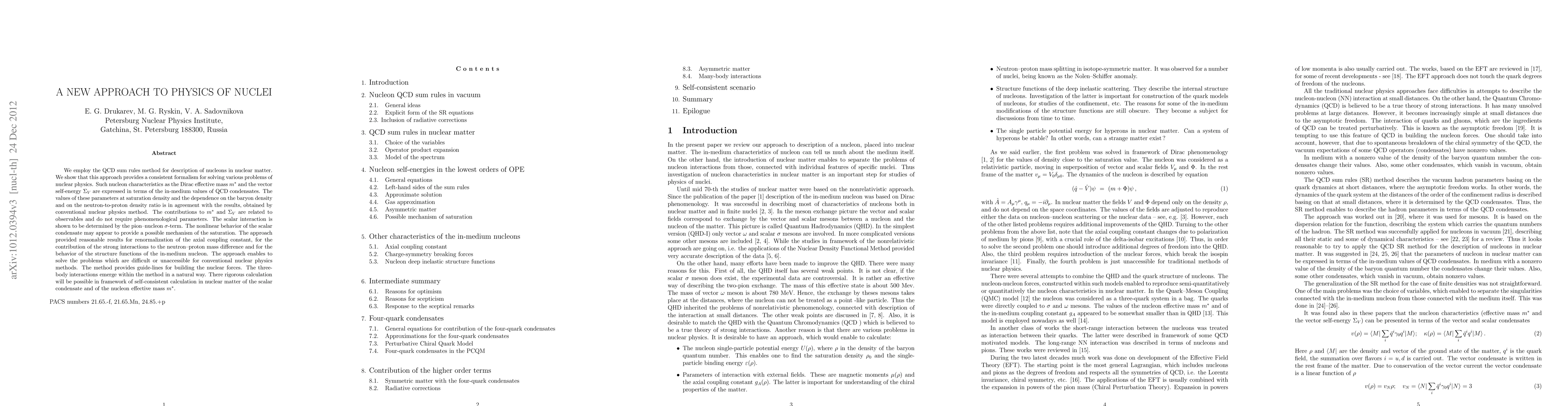 We employ the QCD sum rules method for description of nucleons in nuclear matter. We show that this approach provides a consistent formalism for solving various problems of nuclear physics. Such nucleon characteristics as the Dirac effective mass $m^*$ and the vector self-energy $\Sigma_V$ are expressed in terms of the in-medium values of QCD condensates. The values of these parameters at saturation density and the dependence on the baryon density and on the neutron-to-proton density ratio is in agreement with the results, obtained by conventional nuclear physics method. The contributions to $m^*$ and $\Sigma_V$ are related to observables and do not require phenomenological parameters. The scalar interaction is shown to be determined by the pion--nucleon $\sigma$-term. The nonlinear behavior of the scalar condensate may appear to provide a possible mechanism of the saturation. The approach provided reasonable results for renormalization of the axial coupling constant, for the contribution of the strong interactions to the neutron--proton mass difference and for the behavior of the structure functions of the in-medium nucleon. The approach enables to solve the problems which are difficult or unaccessible for conventional nuclear physics methods. The method provides guide-lines for building the nuclear forces. The three-body interactions emerge within the method in a natural way. There rigorous calculation will be possible in framework of self-consistent calculation in nuclear matter of the scalar condensate and of the nucleon effective mass $m^*$.