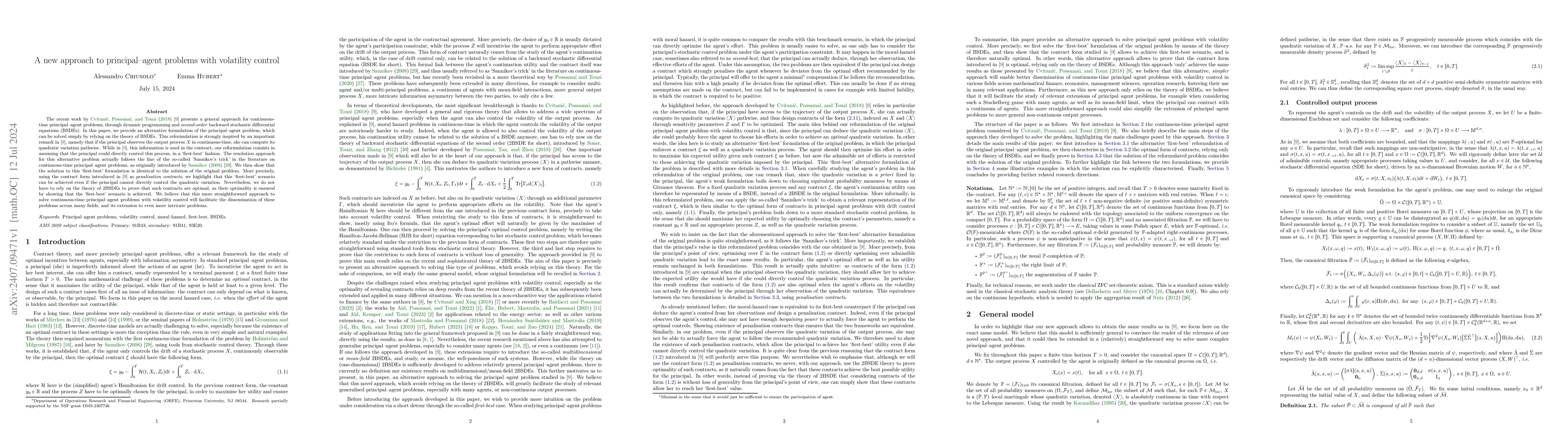 This paper proposes an alternative formulation to solve continuous-time principal-agent problems, leveraging the theory of backward stochastic differential equations (BSDEs). By assuming the principal can control the output process's quadratic variation, it achieves the "first-best" scenario without requiring complex 2BSDE theory, thereby simplifying the resolution approach.