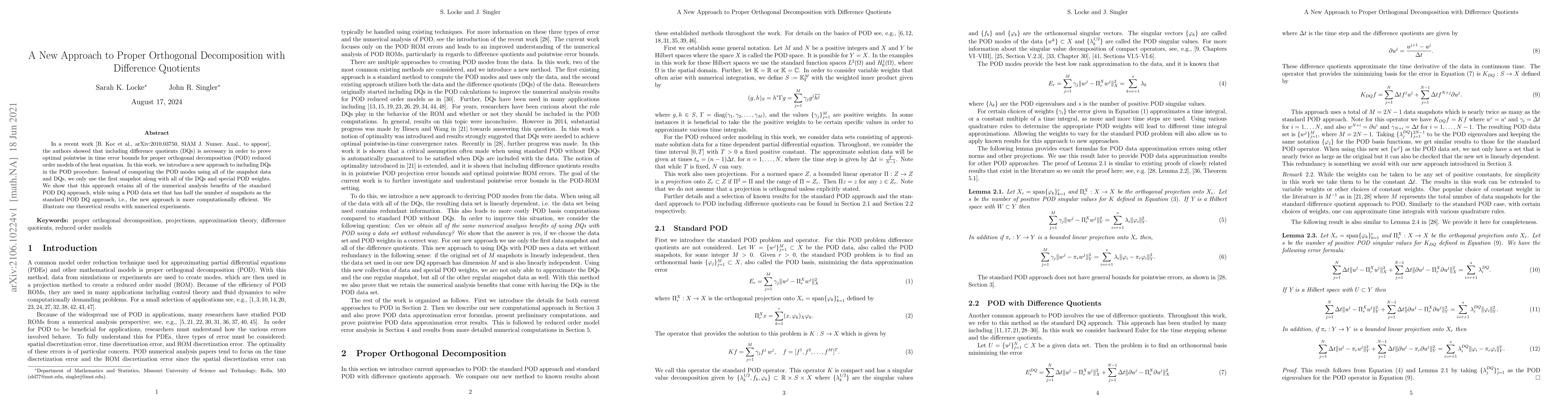 This paper proposes a new method for incorporating difference quotients in proper orthogonal decomposition (POD) to improve reduced order models for the heat equation, using only the first snapshot and DQs, which halves the computational cost while maintaining optimal error bounds. Numerical experiments validate the theoretical benefits of the new approach.