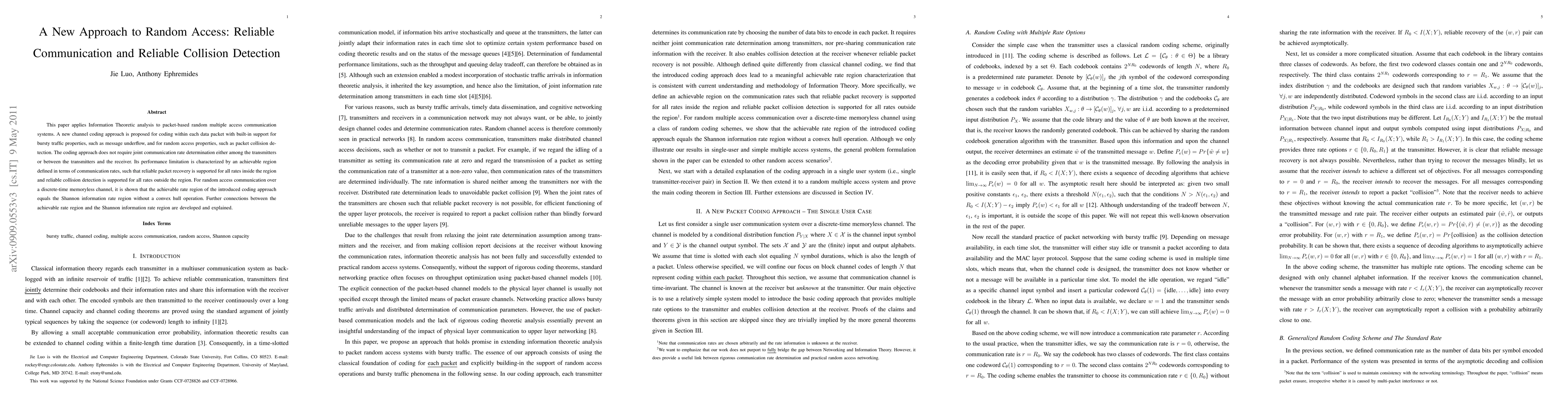 This paper proposes a new channel coding approach for packet-based random access systems, enabling reliable communication and collision detection without joint rate determination. It achieves an achievable rate region equal to the Shannon information rate region for discrete-time memoryless channels.