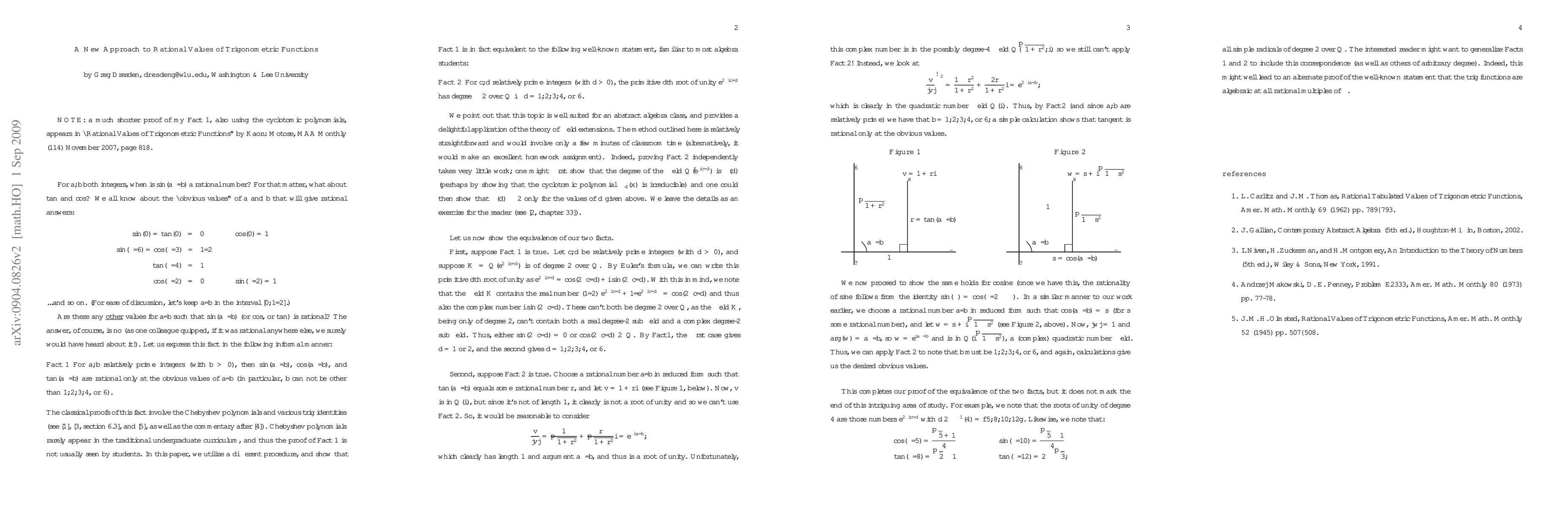 It is well known that sin(a\pi/b), cos(a\pi/b), etc., are only rational numbers for a few select integers a and b. We show that this is equivalent to the fact that only for d = 1,2,3,4, and 6 is the primitive dth root of unity of degree 2 over Q.
