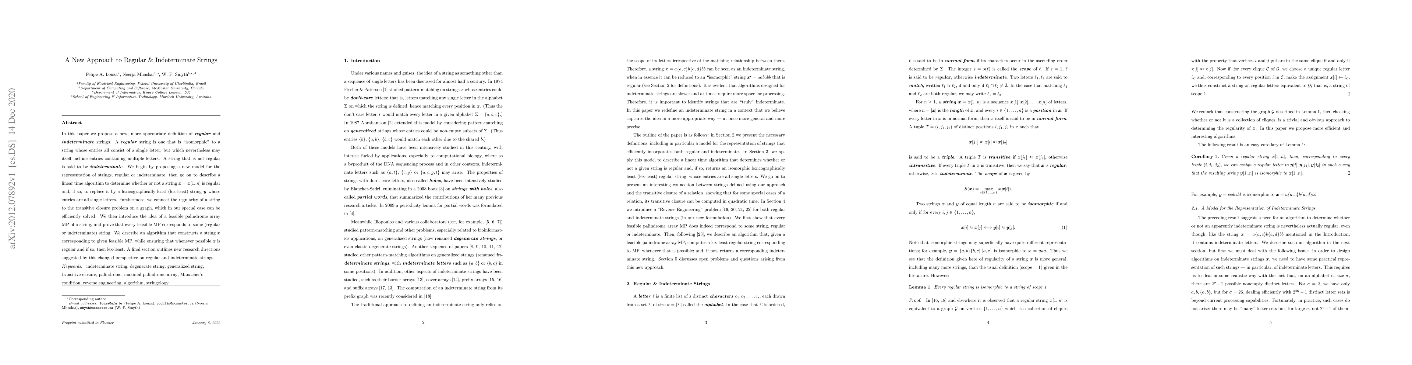 In this paper we propose a new, more appropriate definition of regular and indeterminate strings. A regular string is one that is "isomorphic" to a string whose entries all consist of a single letter, but which nevertheless may itself include entries containing multiple letters. A string that is not regular is said to be indeterminate. We begin by proposing a new model for the representation of strings, regular or indeterminate, then go on to describe a linear time algorithm to determine whether or not a string $x = x[1..n]$ is regular and, if so, to replace it by a lexicographically least (lex-least) string $y$ whose entries are all single letters. Furthermore, we connect the regularity of a string to the transitive closure problem on a graph, which in our special case can be efficiently solved. We then introduce the idea of a feasible palindrome array MP of a string, and prove that every feasible MP corresponds to some (regular or indeterminate) string. We describe an algorithm that constructs a string $x$ corresponding to given feasible MP, while ensuring that whenever possible $x$ is regular and if so, then lex-least. A final section outlines new research directions suggested by this changed perspective on regular and indeterminate strings.